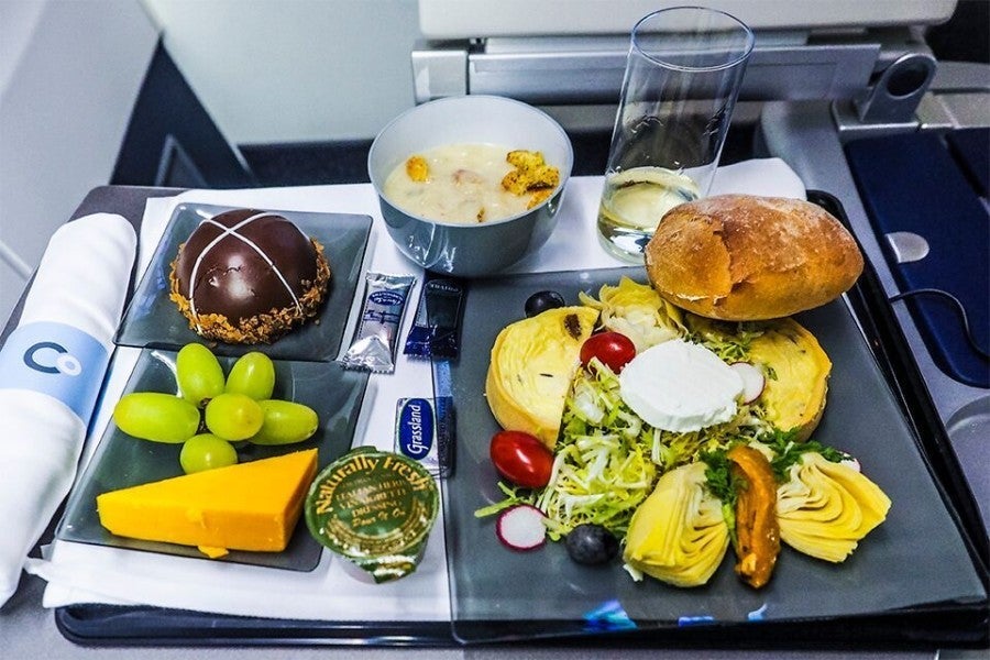 Dinner was basic at best, with a small, simple chive quiche; a frisée salad with a pat of goat cheese, artichoke hearts and little else; a cup's worth of creamy potato soup with bacon; a crusty roll; a wedge of cheddar; and for dessert, a chocolate bombe glacée (this is a French airline, after all). But honestly, I didn't book this flight for the promise of amazing food, so I wasn't too disappointed. That said, I'd personally recommend eating something at the airport (check out Grand Central Oyster Bar at EWR's Terminal C) and using the six-and-a-half-hour journey to sleep.