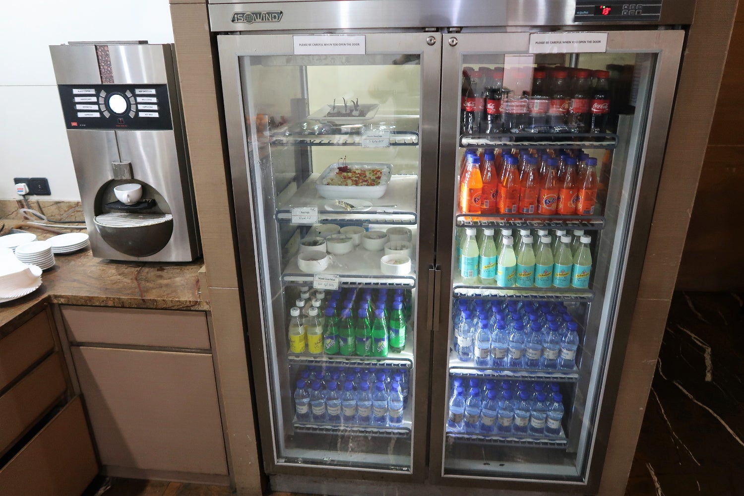 Two glass-faced refrigerators contained bowls with green salad, a pudding dish that was surprisingly tasty, a plate of brownies and a variety of bottled water and soft drinks.