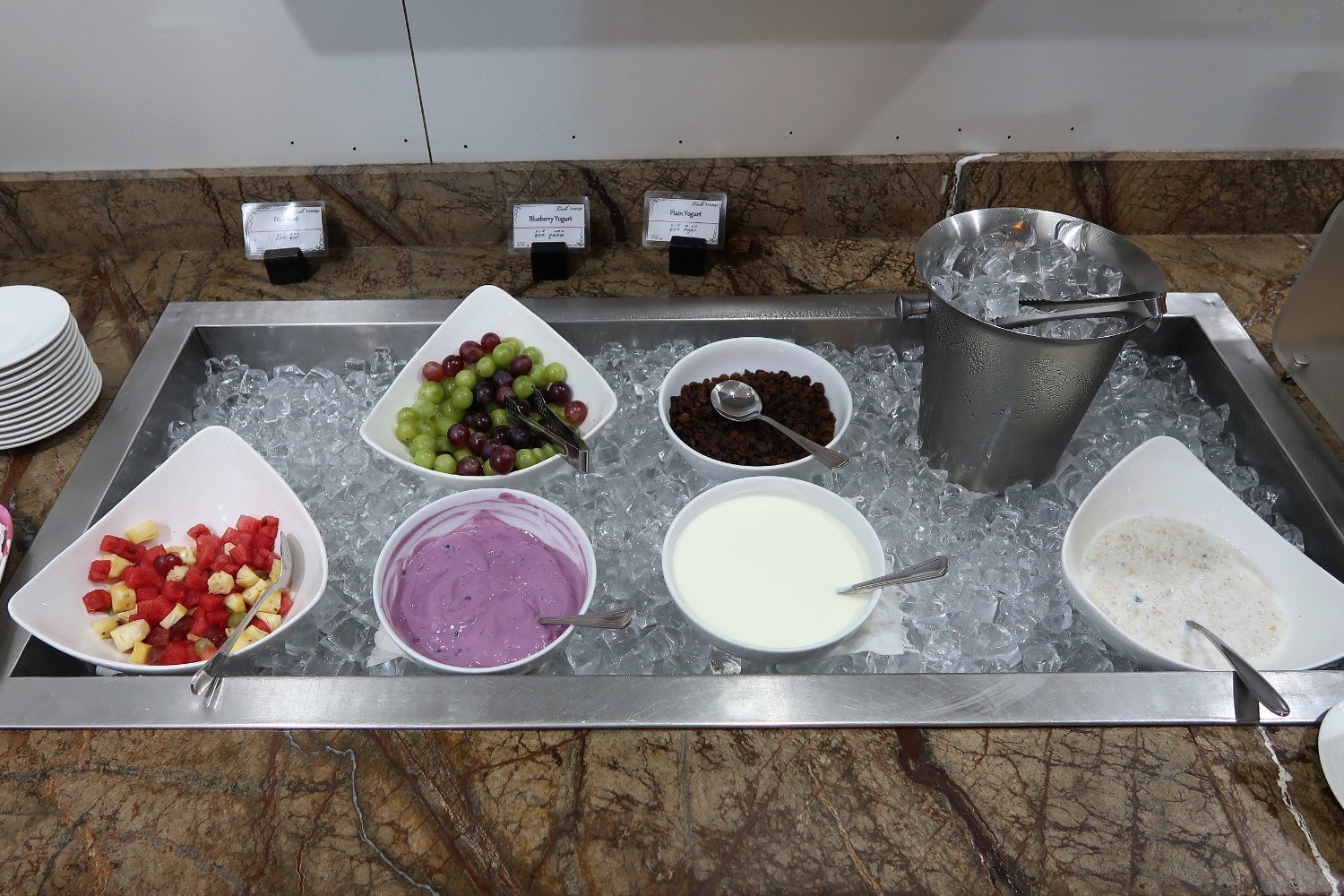 An iced container held multiple bowls containing fresh fruit salad, grapes, blueberry yogurt, plain yogurt, muesli and raisins. Above this cold area was a shelf with cup of noodles. Further down the bar were cereal containers and some more fresh fruit.
