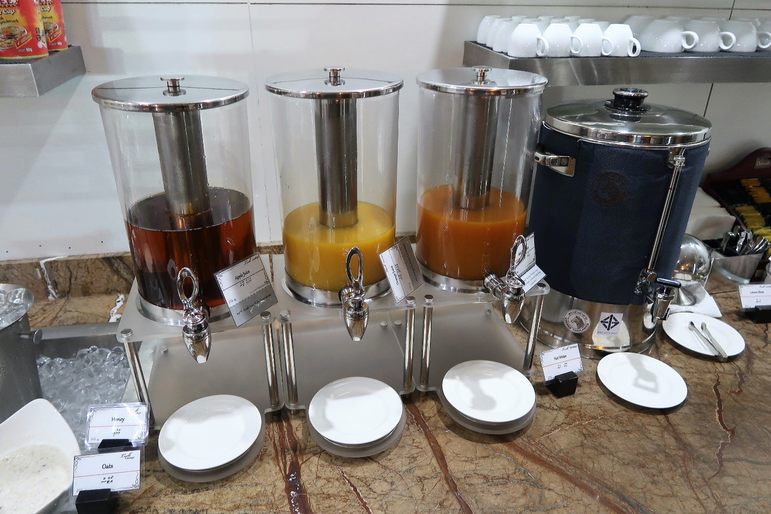 On the counter, there were also containers of juice, a container of hot water and a coffee machine.