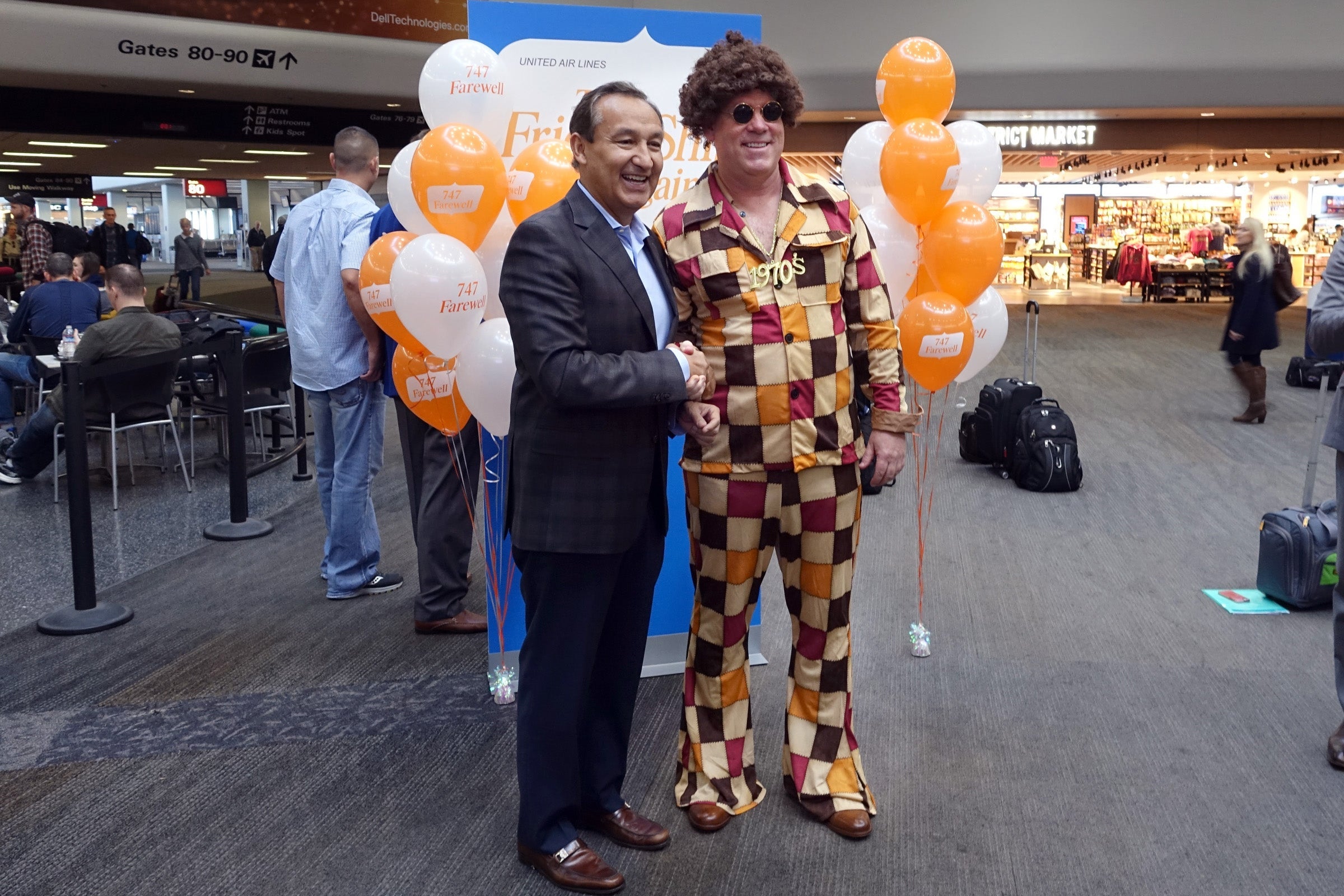 I caught United CEO Oscar Munoz long before we made it to 86, though, working his way through a long line of employees and fans. That's where I first bumped into Michael Green, who really dressed for the occasion after having redeemed 90,000 United miles (earned with his Chase Sapphire Reserve card) to score a seat on the upper deck.