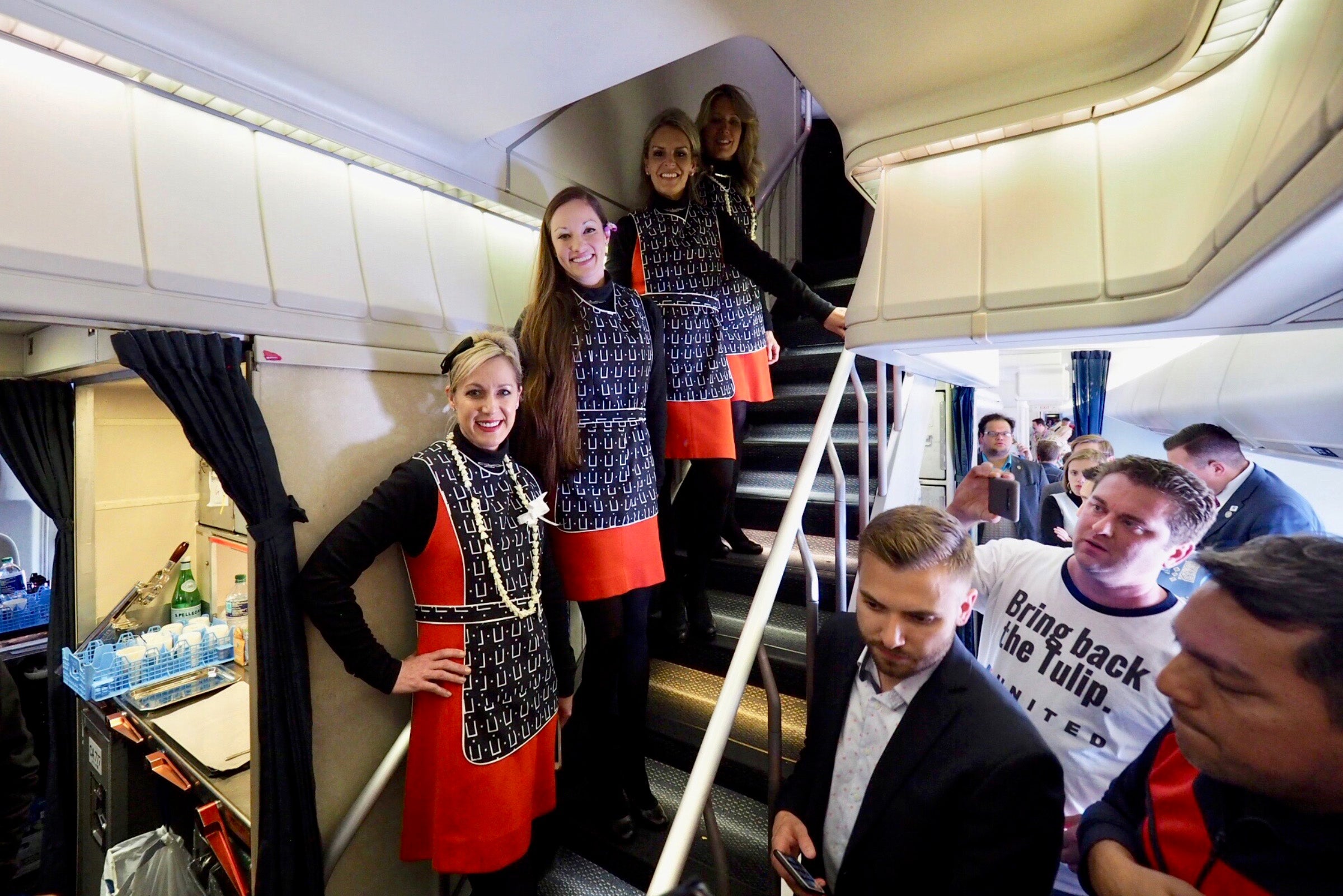 The food was another highlight, of course. United went all out with a menu designed to rival the courses and entrees served during the glory days of aviation. The celebration began with a 747-wide toast — flight attendants went from nose to tail, delivering Champagne to each and every passenger.
