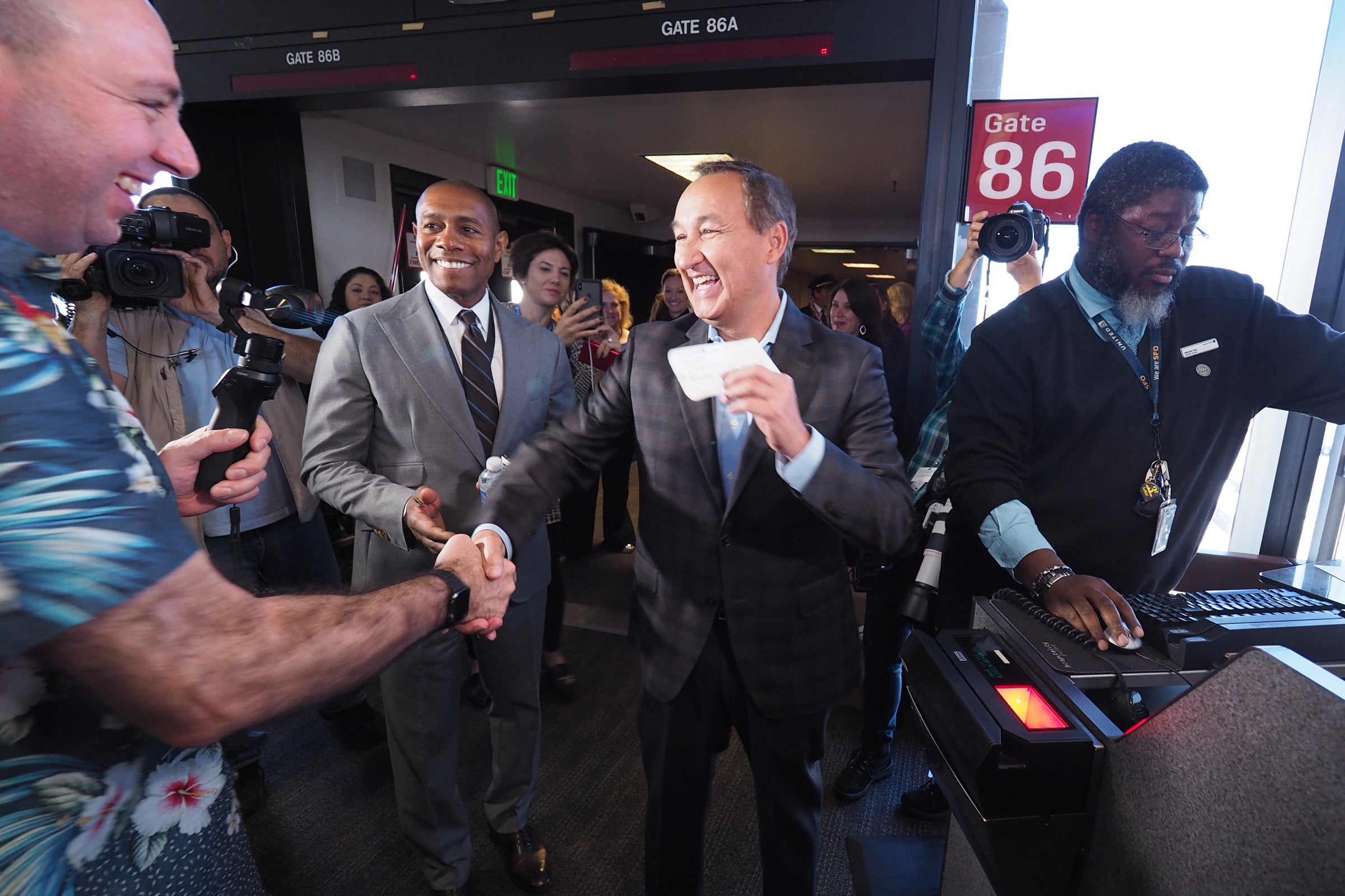 The CEO himself scanned many of the passengers' boarding passes, greeting each one as they stepped through the gate.