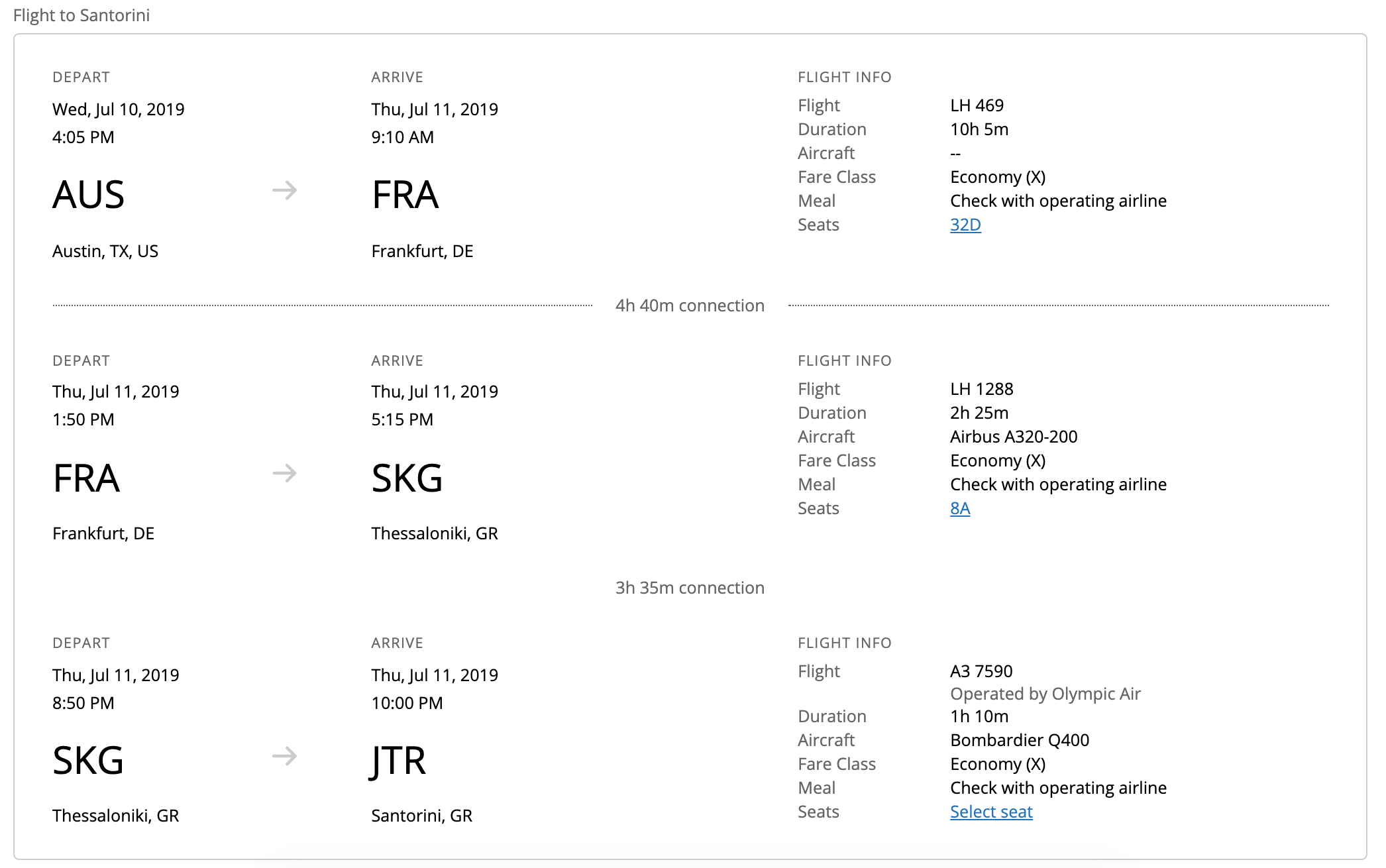 I booked this flight using 30,000 United MileagePlus points — the first segment of a three-flight itinerary to Santorini, Greece (JTR), to attend the wedding of two friends. According to TPG's current valuations, the 30,000 United miles I used are worth about $390. Compared to the cash price of $2,550, I got an excellent value for my points.