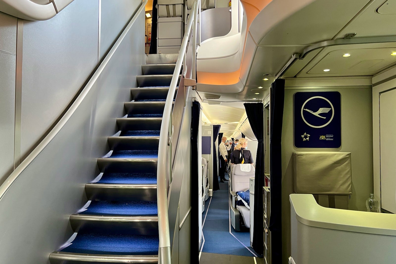 In fact, the plane's main welcome area is right next to this stairwell, and thanks to the large stairs (compared to the now-retired 747-400) and the addition of two windows, it feels bright and airy.