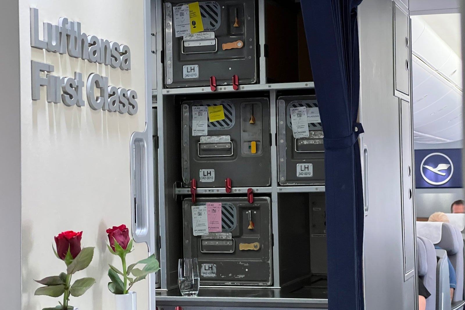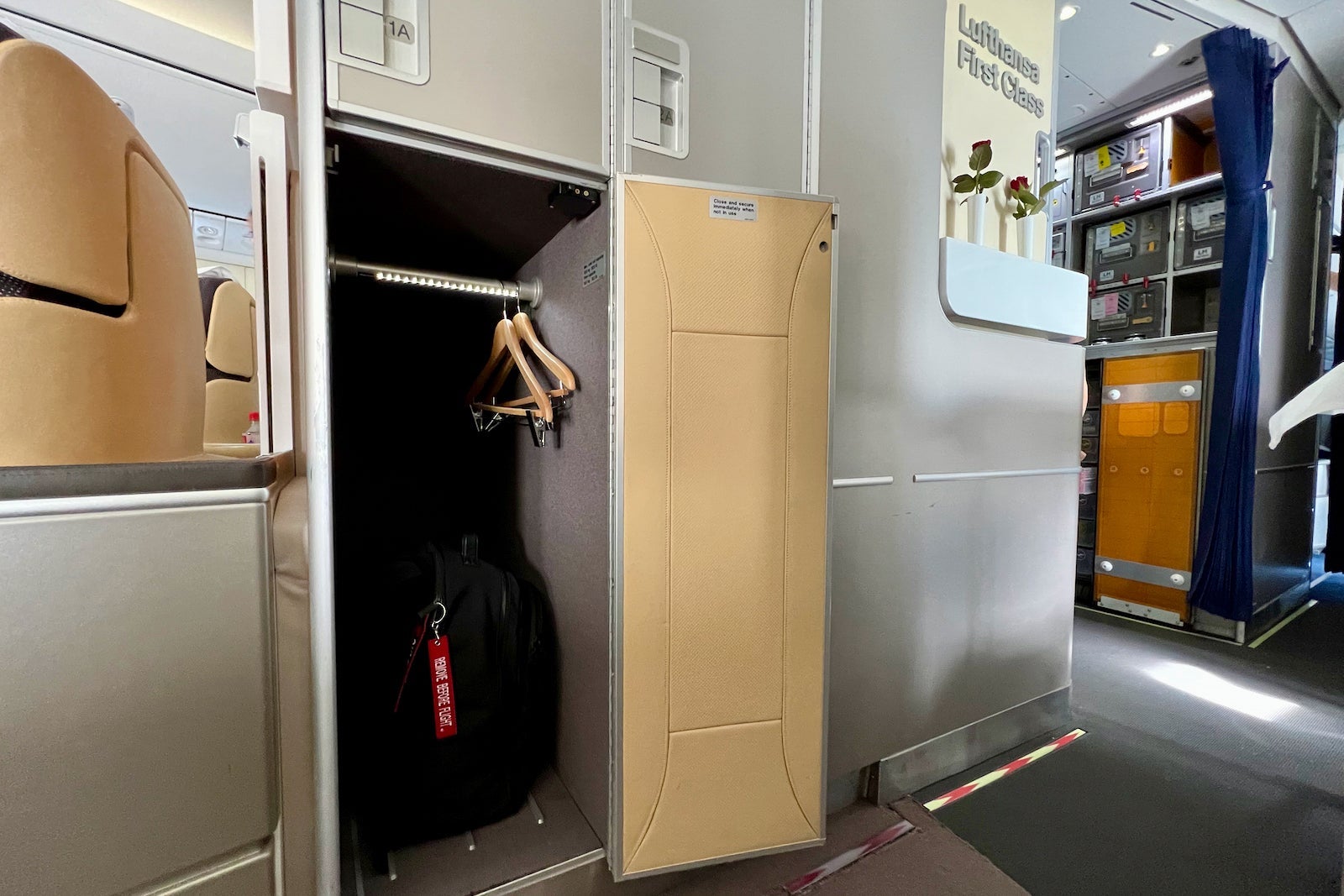Each first-class passenger is assigned a cubby built into the galley at the rear of the cabin. The cubby has space for a standard-size rollaboard, as well as some hangers for your jackets and clothes.