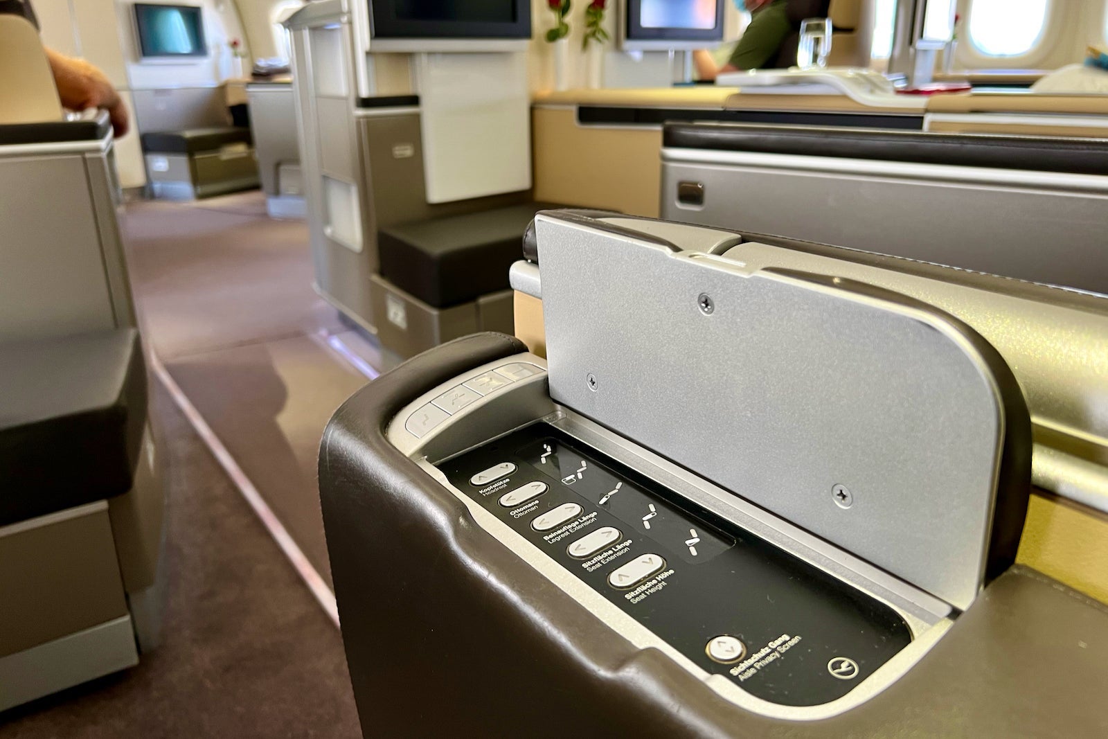 The bones of the seats are the same across the entire first-class fleet. Though they might resemble a souped-up version of an office chair, they're incredibly comfortable — measuring 21 inches wide with the armrests up. Lowering them adds another 10 inches of width to the seat.