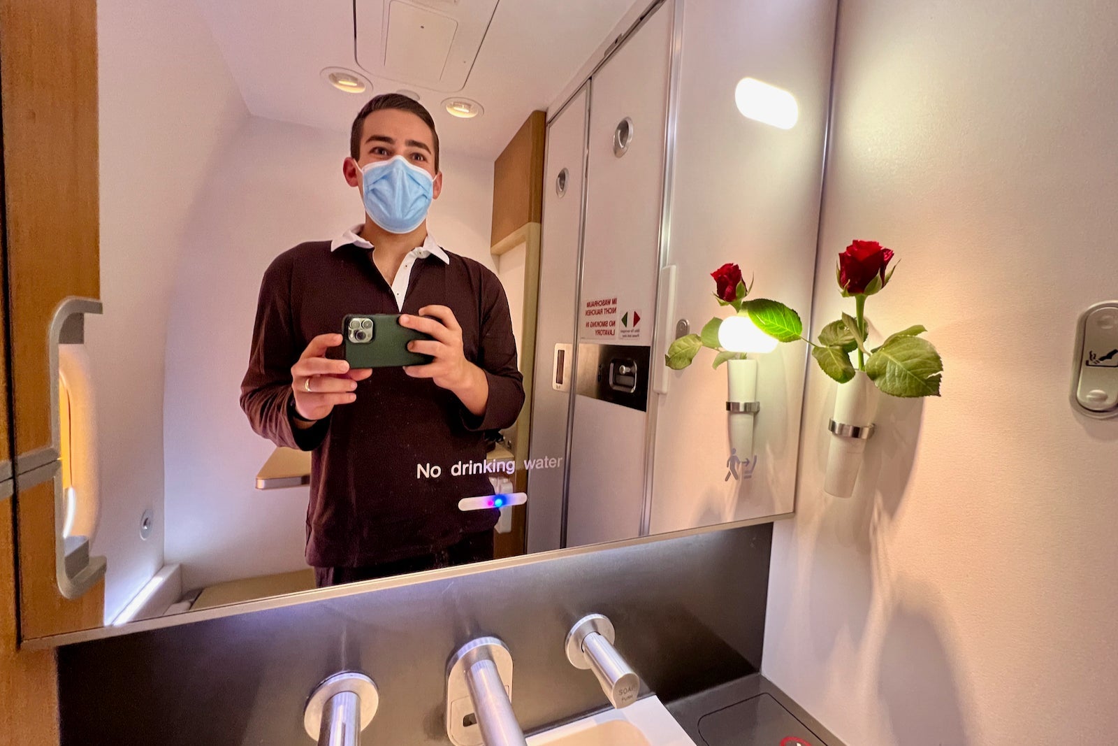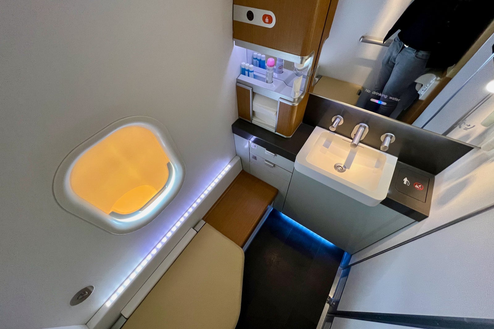 While the A380 features oversized restrooms with a bench, urinal and changing area, the lavatories on the 747-8 are much smaller, though they're still appointed with a rose, and have a window and full-size amenities, like Evian facial spray.