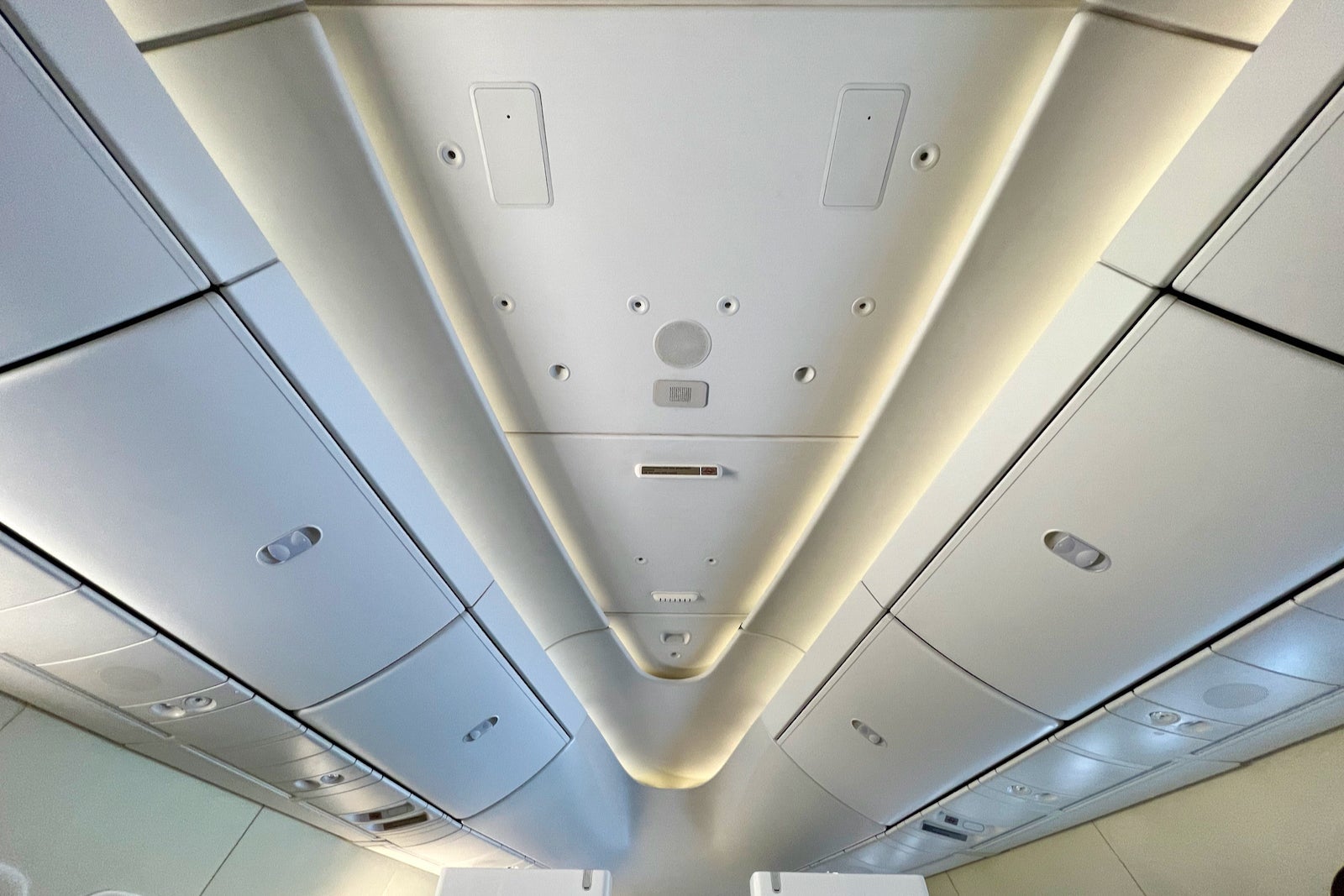 In fact, instead of overhead bins, Lufthansa installed 17 LED lights above the center seats. When illuminated, the lights accentuate the bar area and add a luxurious touch to the well-designed cabin.