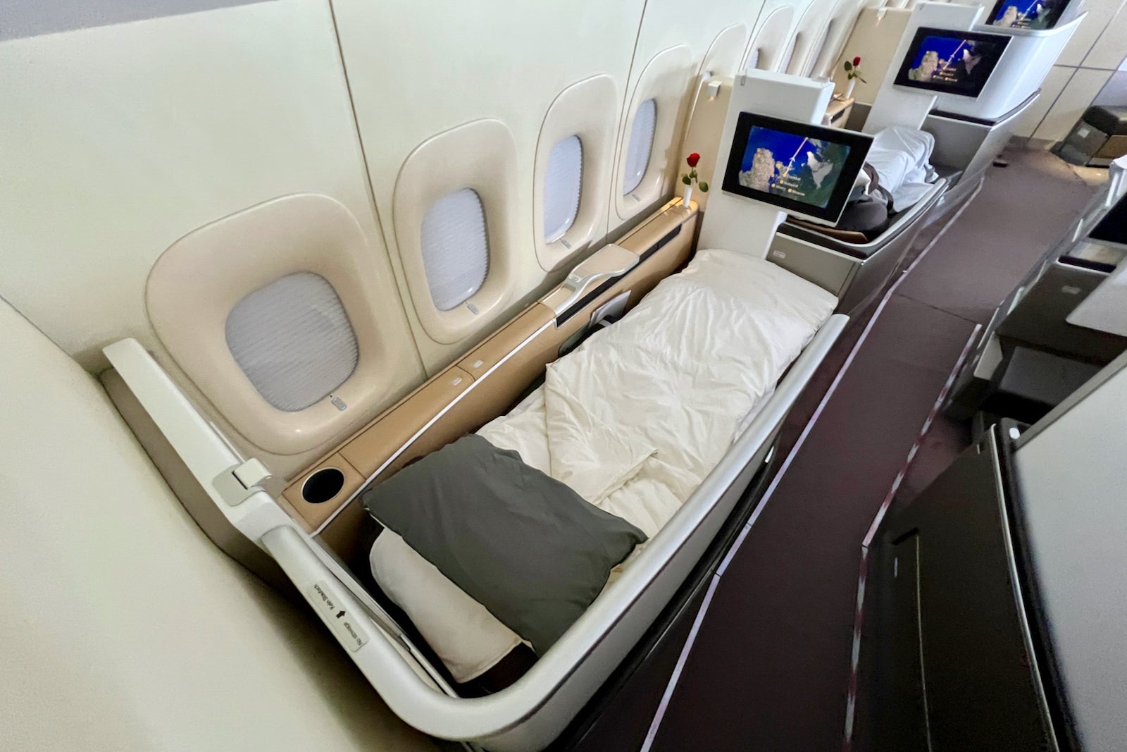 Turndown service is provided when it's time for a nap. The seat will be topped with a comfortable mattress pad, along with a duvet and a plush pillow. There's also a day blanket available on request should you need one.