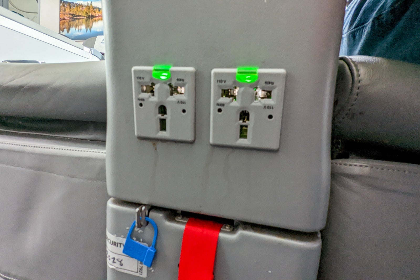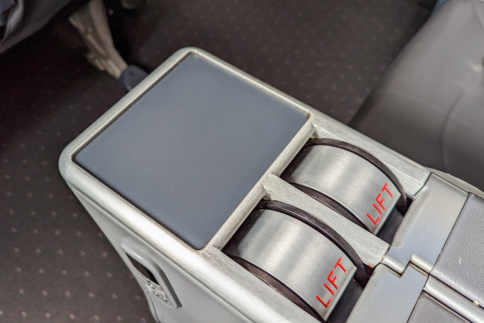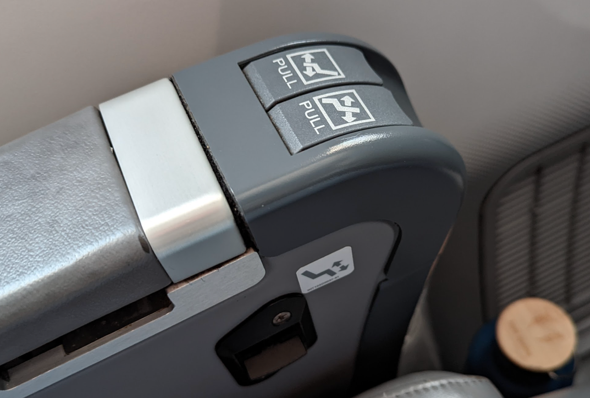 The recline was operated by a lever on my right armrest, with another lever to swing out the leg rest (which also had a footrest that could be manually folded down). Other features of the seat included a beverage tray extending out of the center armrest that was shared with the seat next to me and a charging point for each seat just below that. There was also a small and fairly flimsy tray table (just large enough for my 15-inch laptop) that folded out from the armrest, plus an adjustable headrest.