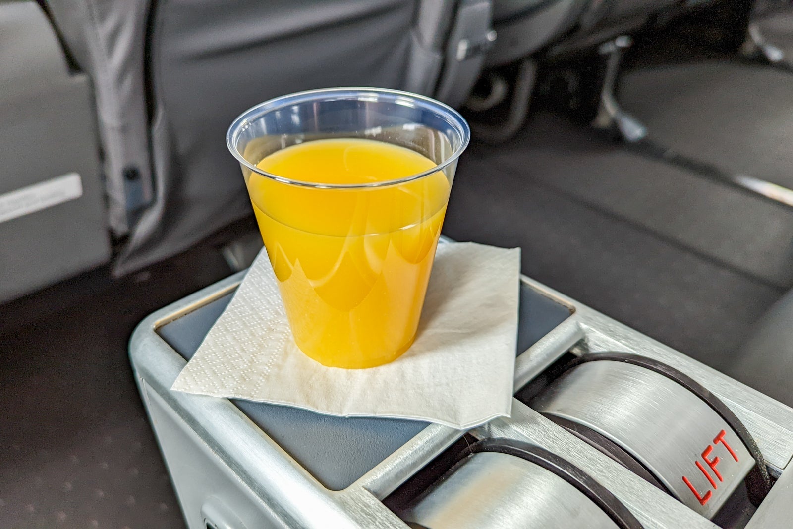 The crew passed through the cabin during boarding offering a choice of water, apple or orange juice in pre-poured plastic cups. While no Champagne or sparkling wine was offered, this was still a nice touch.