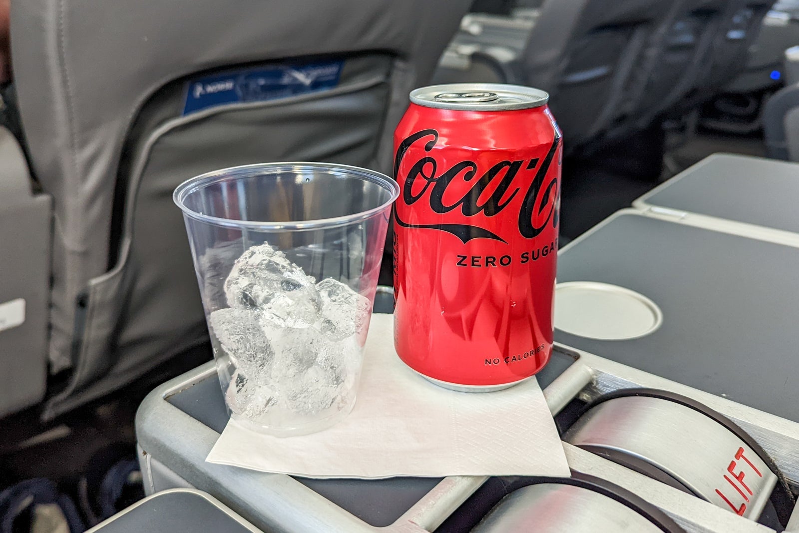 One beer, wine or soft drink per meal was provided free of charge to the Premium cabin, though spirits came with an extra charge. As this was a Tuesday, I opted for a Coke Zero instead of alcohol, and it was served with a cup of ice.