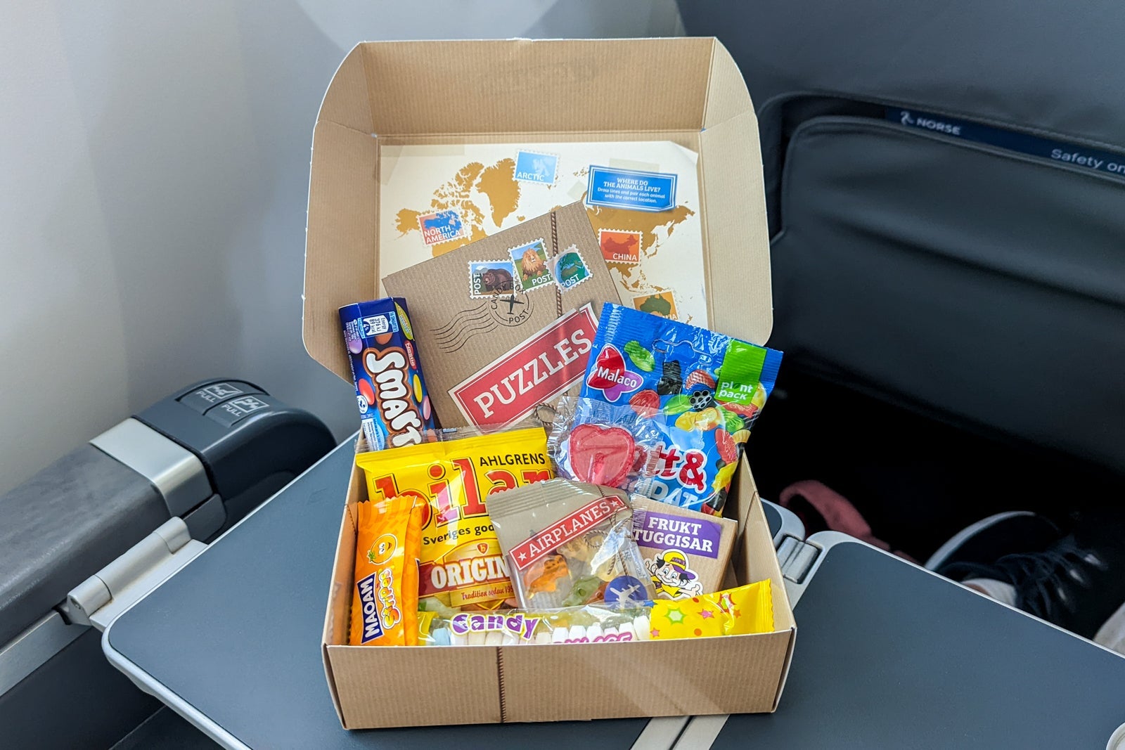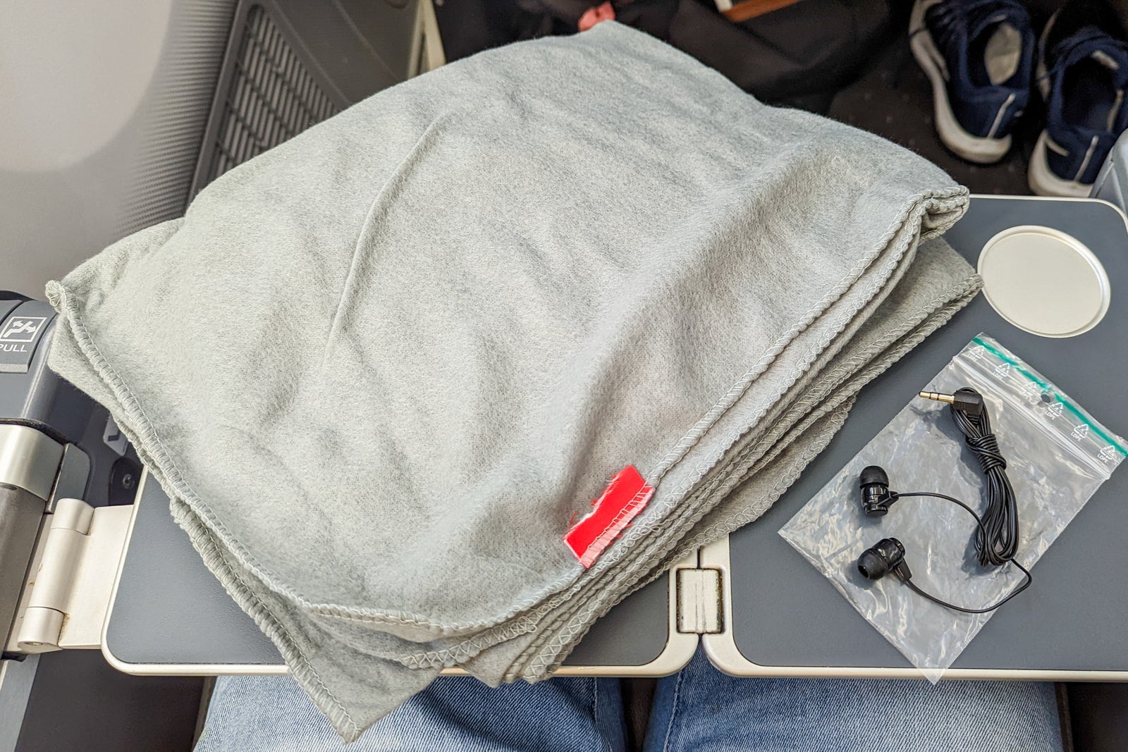 No bedding or pillows were waiting for me when I boarded, another reminder this was indeed a low-cost carrier. Shortly after takeoff, the crew distributed complimentary earbud headphones and thin blankets to the passengers in the Premium cabin. The headphones were terrible quality but I grinned when I realized the blankets were the old Norwegian-branded blankets with the tags just roughly hacked off with scissors.