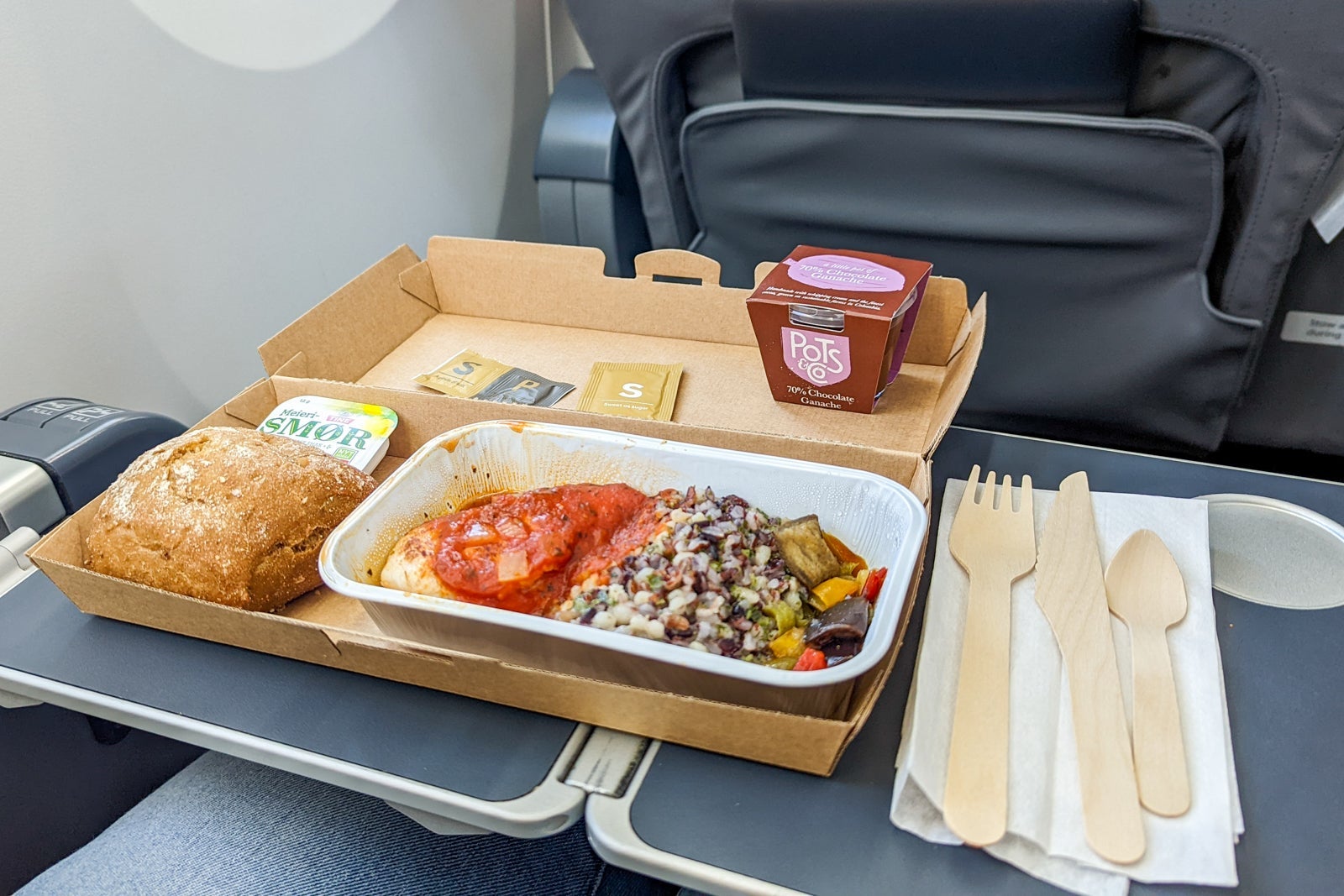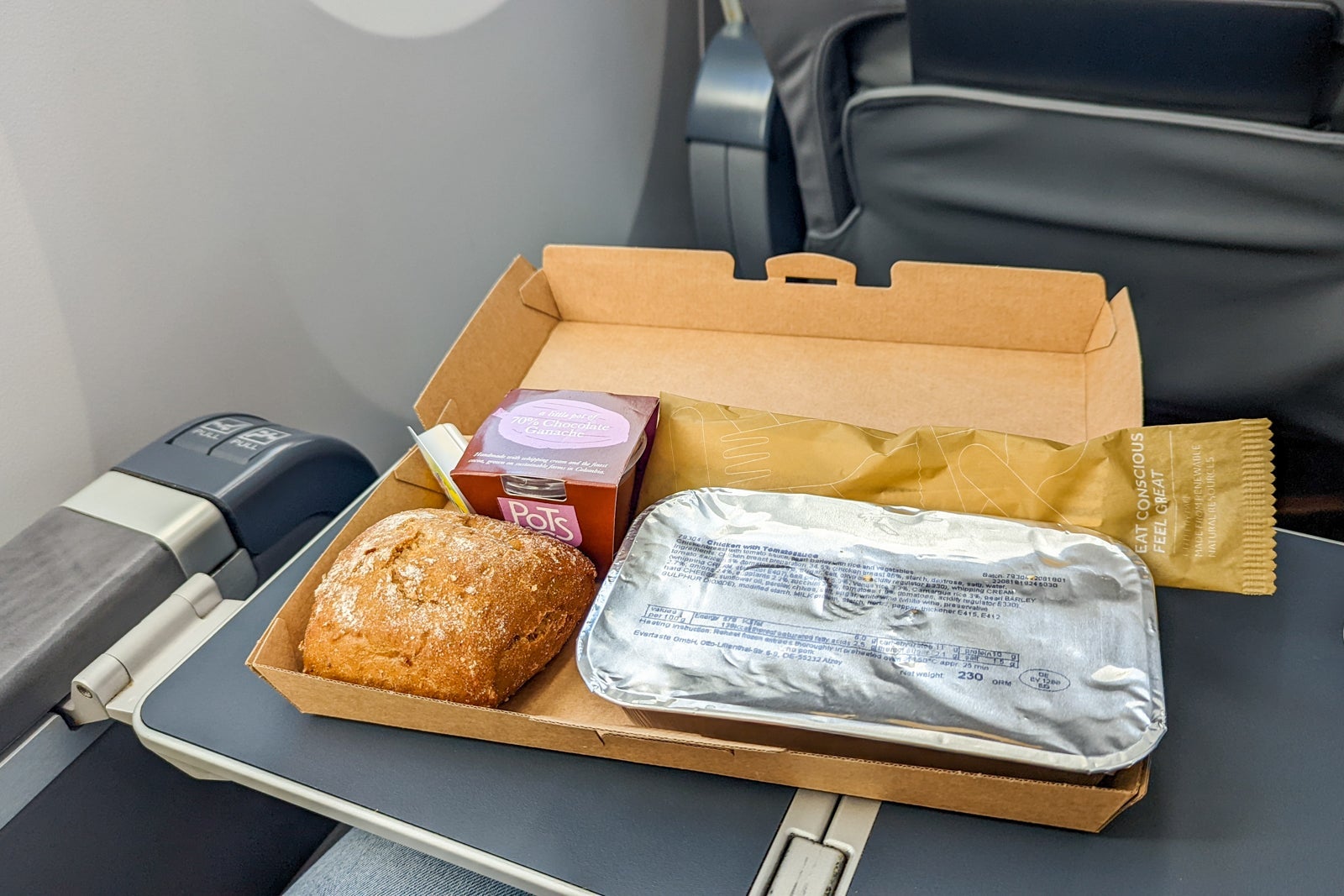 Premium passengers receive two meals included on flights across the Atlantic. As the crew wheeled trolleys through the cabin they advised me there were three lunch options: chicken with tomato sauce, vegetables with rice, or salmon with horseradish cream sauce. I chose the chicken option and was handed a cardboard box containing the entire meal.