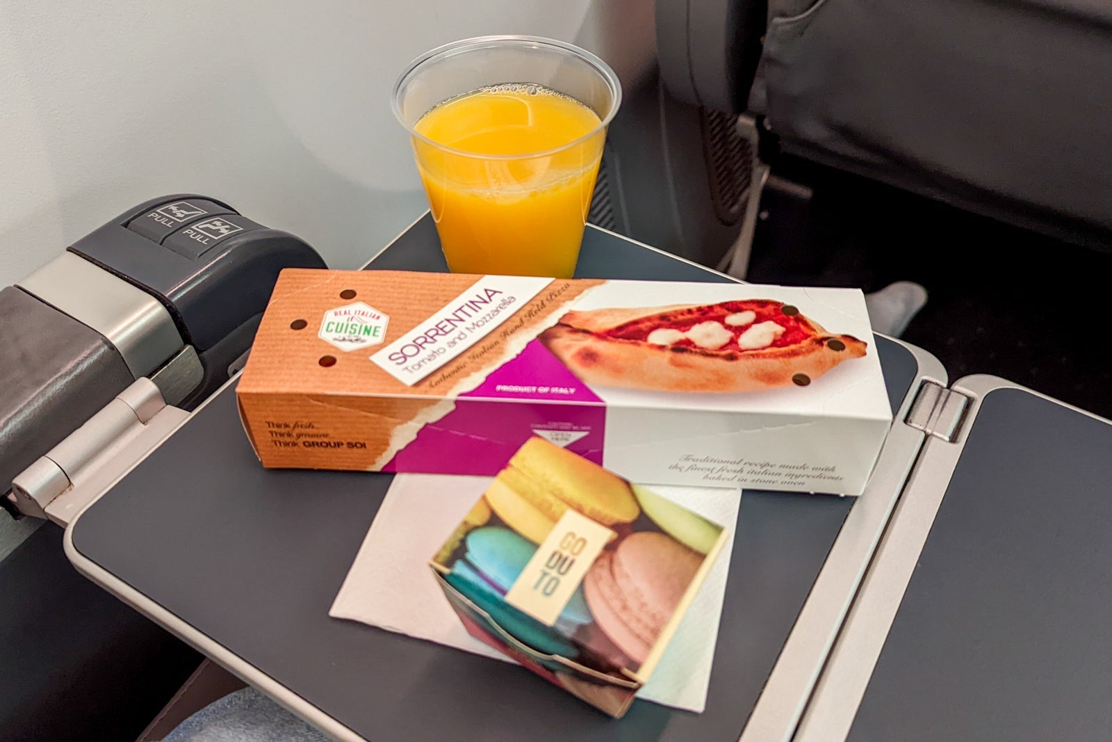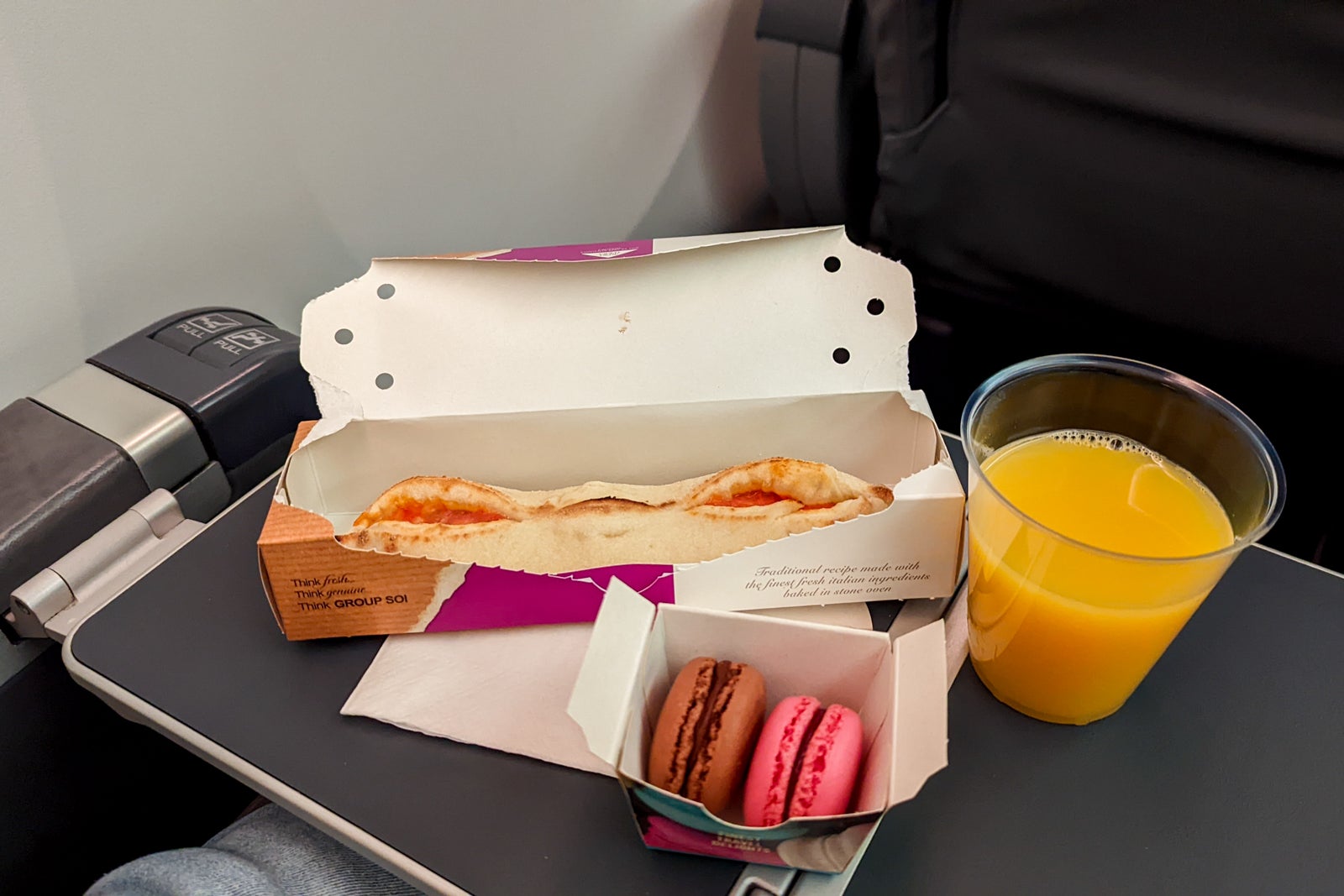 Ninety minutes before landing, the second meal was served. I've flown between London and New York more times than I can remember and my common grumble is that the second meal served is never big enough in economy or premium economy on any airline. Norse Atlantic was no exception. The only option was a tomato and mozzarella "Sorrentina," which was halfway between an Italian calzone and a Turkish pide. It was carby, cheesy and fairly small, as expected.