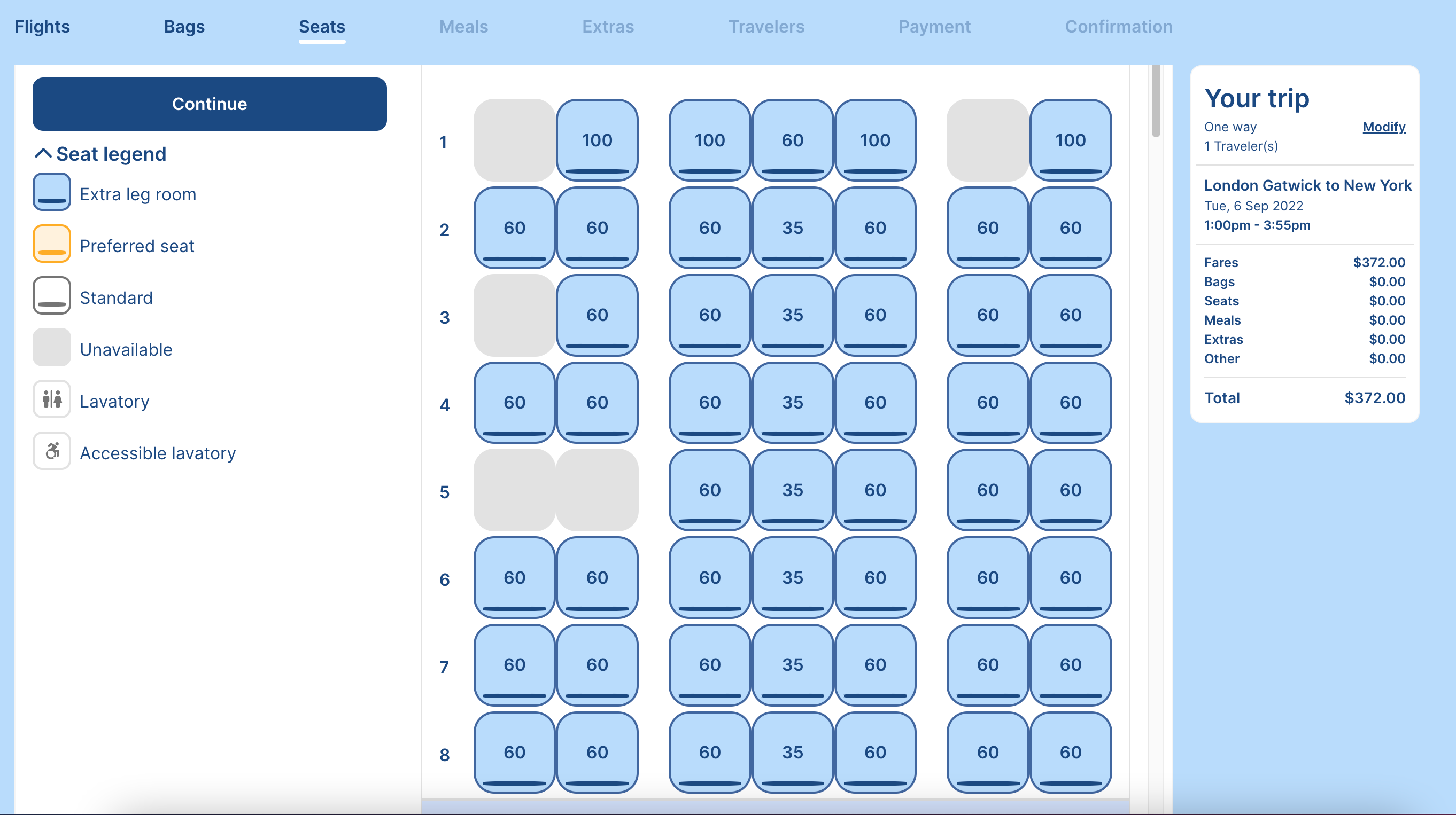 Norse Atlantic charges steep seat selection fees in the Premium cabin, with a middle seat choice starting at $35 per person up to $100 for a front row window or aisle seat with extra legroom.