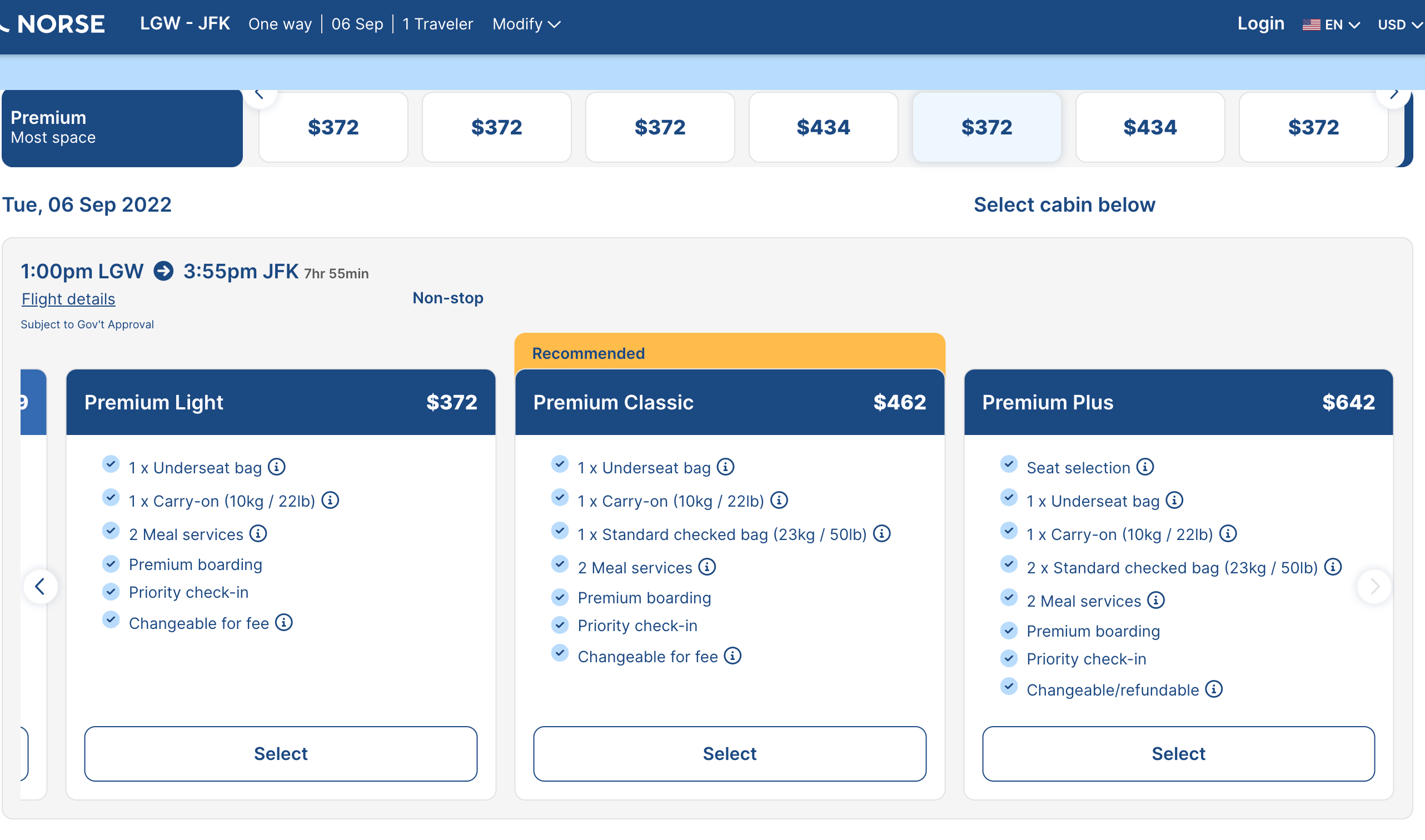 Fortunately, Norse Atlantic offered affordable one-way fares in both directions in economy and premium economy when I was looking at flights. TPG's Ethan Klapper took the cheapest economy option he could find on the airline's inaugural long-haul flight from JFK to Oslo, Norway, recently. I decided to travel a little more comfortably, trying out the airline's premium economy cabin instead. At only $372, a Premium Light fare was a terrific value and included a full-size carry-on (plus a smaller personal item), two meals, priority check-in and boarding, and a seat in the premium economy cabin, though not seat selection.