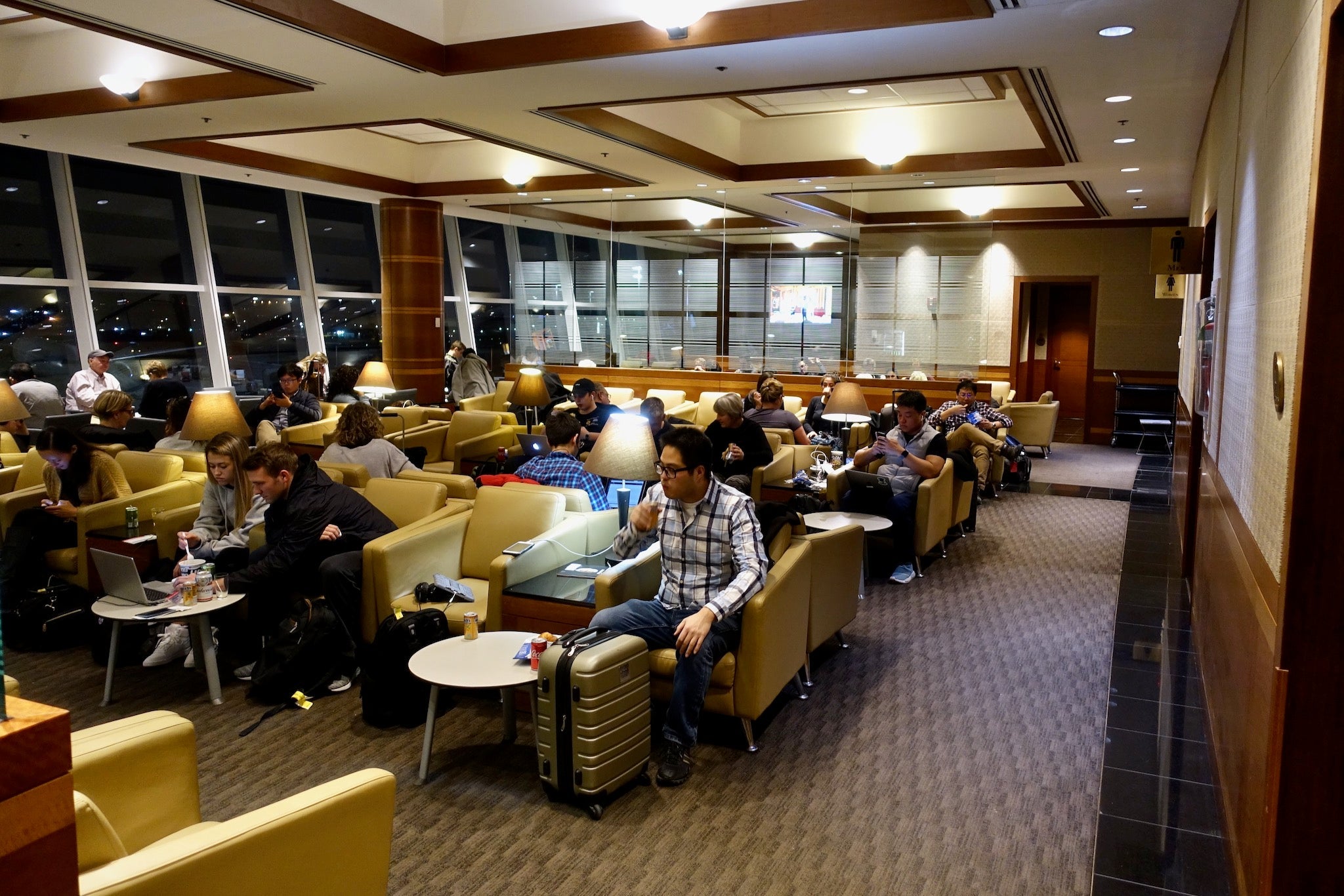The lounge felt past its prime and was jam-packed when I arrived. Note that this photo was taken minutes before the lounge closed to Priority Pass members, so seats opened up as people began to leave.