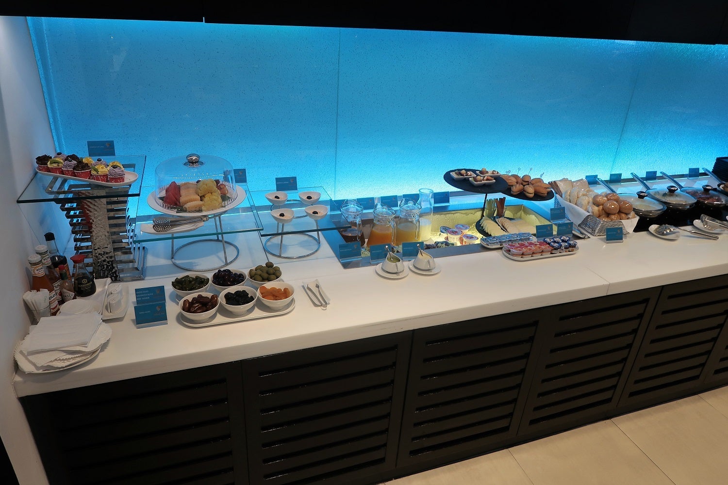 Food and beverages were available along an L-shaped buffet area in the main lounge — food on one bar and drinks on the other.