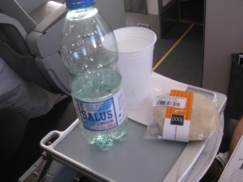 Once the purser's nails were in sufficient shape, she decided to do cart service for buy-on-board snacks and beverages. Even water was $3 USD- it reminded me of US Airway's days when they charged for everything, including water. In the spirit of fair reporting, I had to buy something to write about, so I went with the Caprese Pita with tomato for $4. When they handed it to me, it looked like a cookie and it ended up being edible.