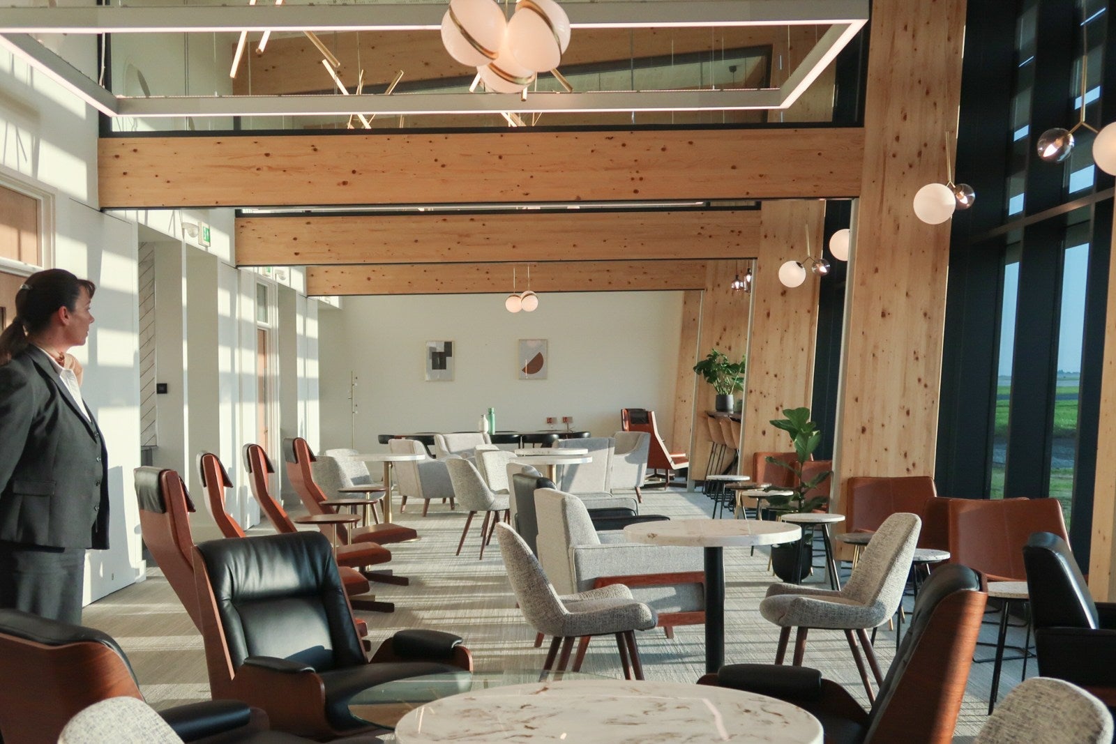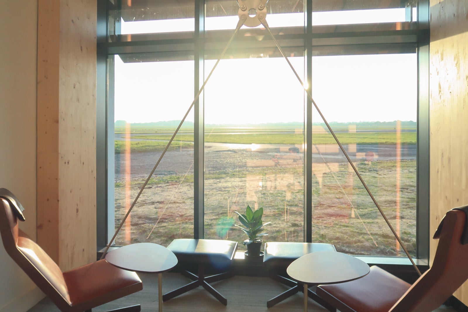 A few seconds later, I was shown into the lounge. I think I actually uttered a "wow" when I walked in. The floor-to-ceiling glass wall facing the airport runways filled the space with so much light, showing off the stunning exposed wood and beautifully coordinated decor and furnishings. It really was quite something.
