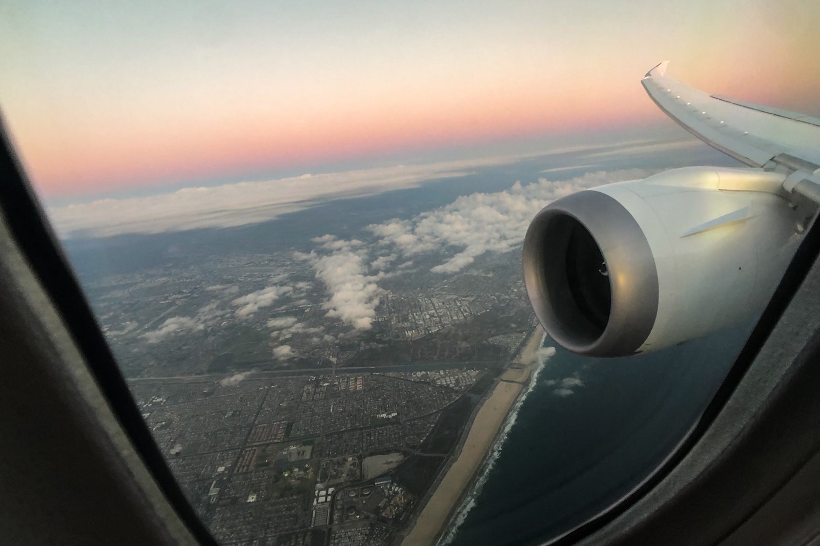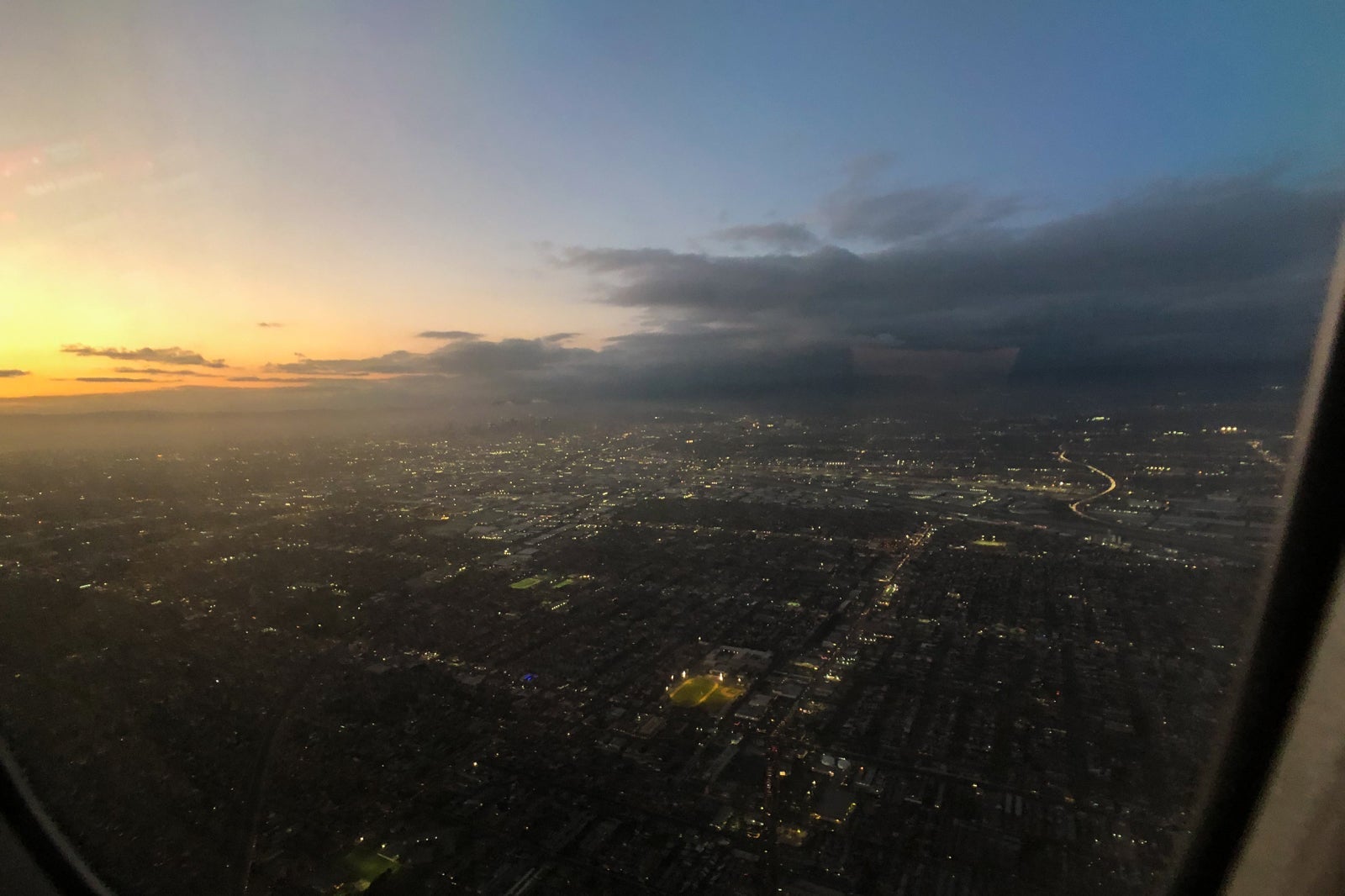 Shortly after I finished the second meal, we began our initial descent into Los Angeles. It was lovely just watching the sunset over the city as we swung inland then banked past downtown for our approach into Los Angeles International Airport (LAX).