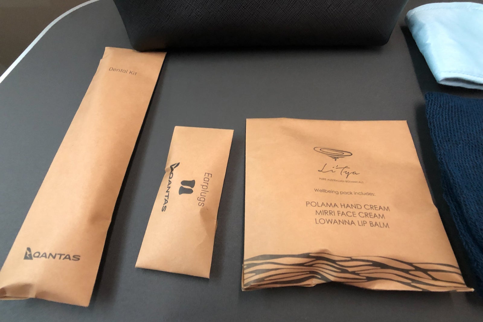 Qantas has been trying to make its amenity kits more sustainable, so this one contained several items wrapped in recycled, compostable paper, including toothpaste and a bamboo toothbrush, socks made from a bamboo-polyester blend, ear plugs, an eye mask and a trio of Li-Tya products: Polama hand cream, Mirri face cream and Lowanna lip balm.