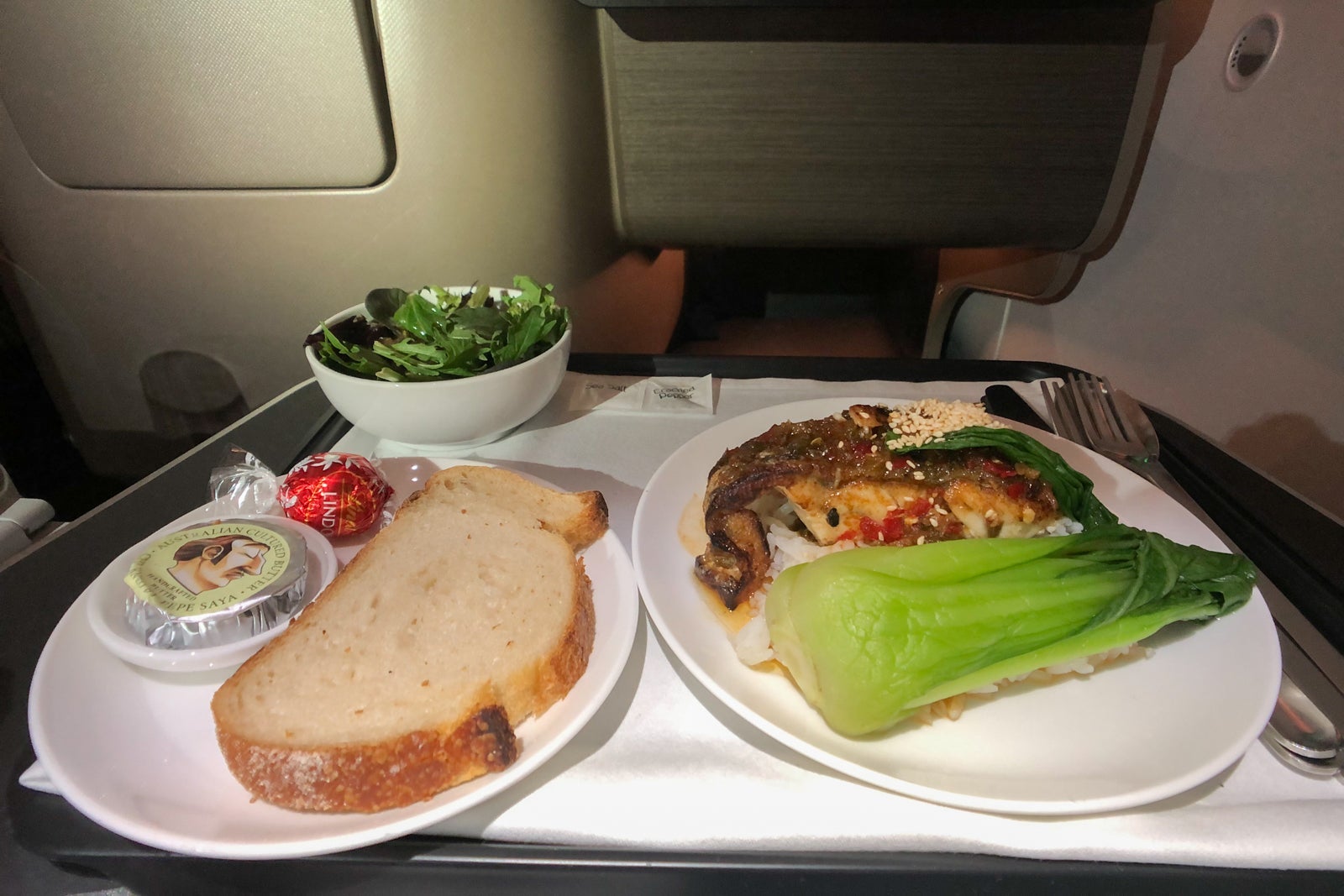 Flight attendants set out tablecloths and trays and served the salad from a cart while pouring drinks — I chose a Shaw + Smith Sauvignon Blanc — then returned about 15 minutes later with the main courses. The fish was a nice combination of firm and juicy textures and sweet, salty and spicy flavors. I got a glass of berry-forward Heirloom Vineyards Shiraz from the Barossa Valley to go along with it.