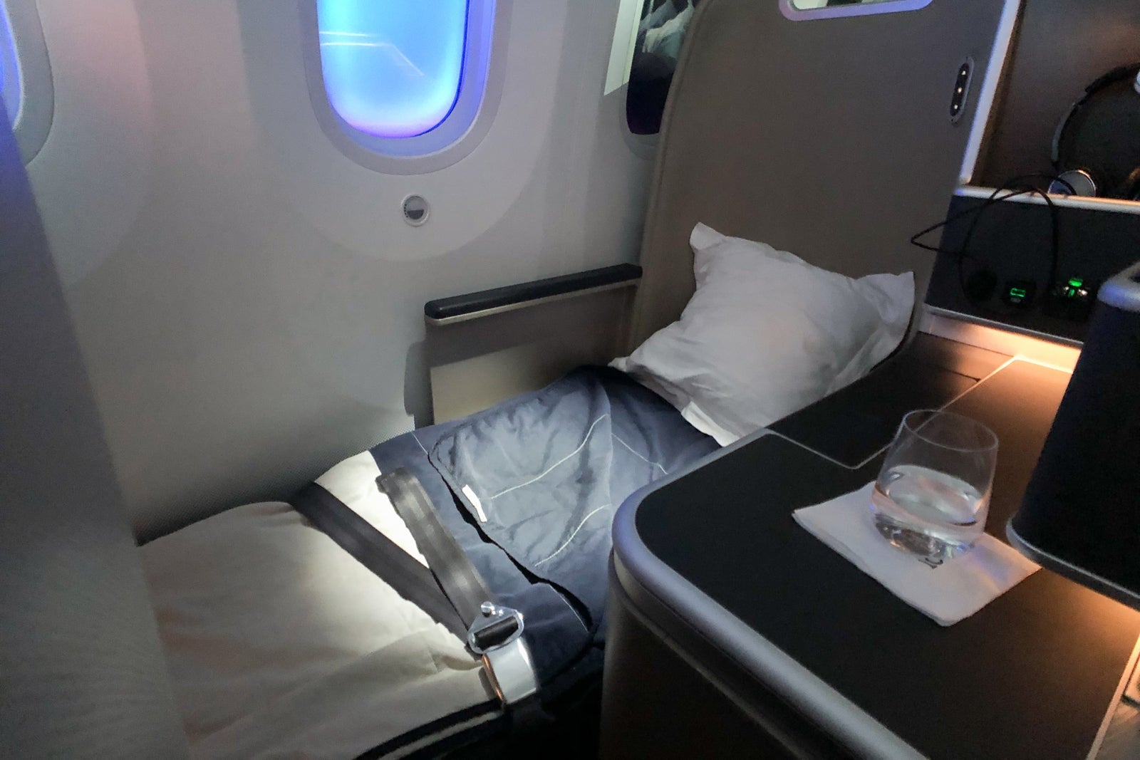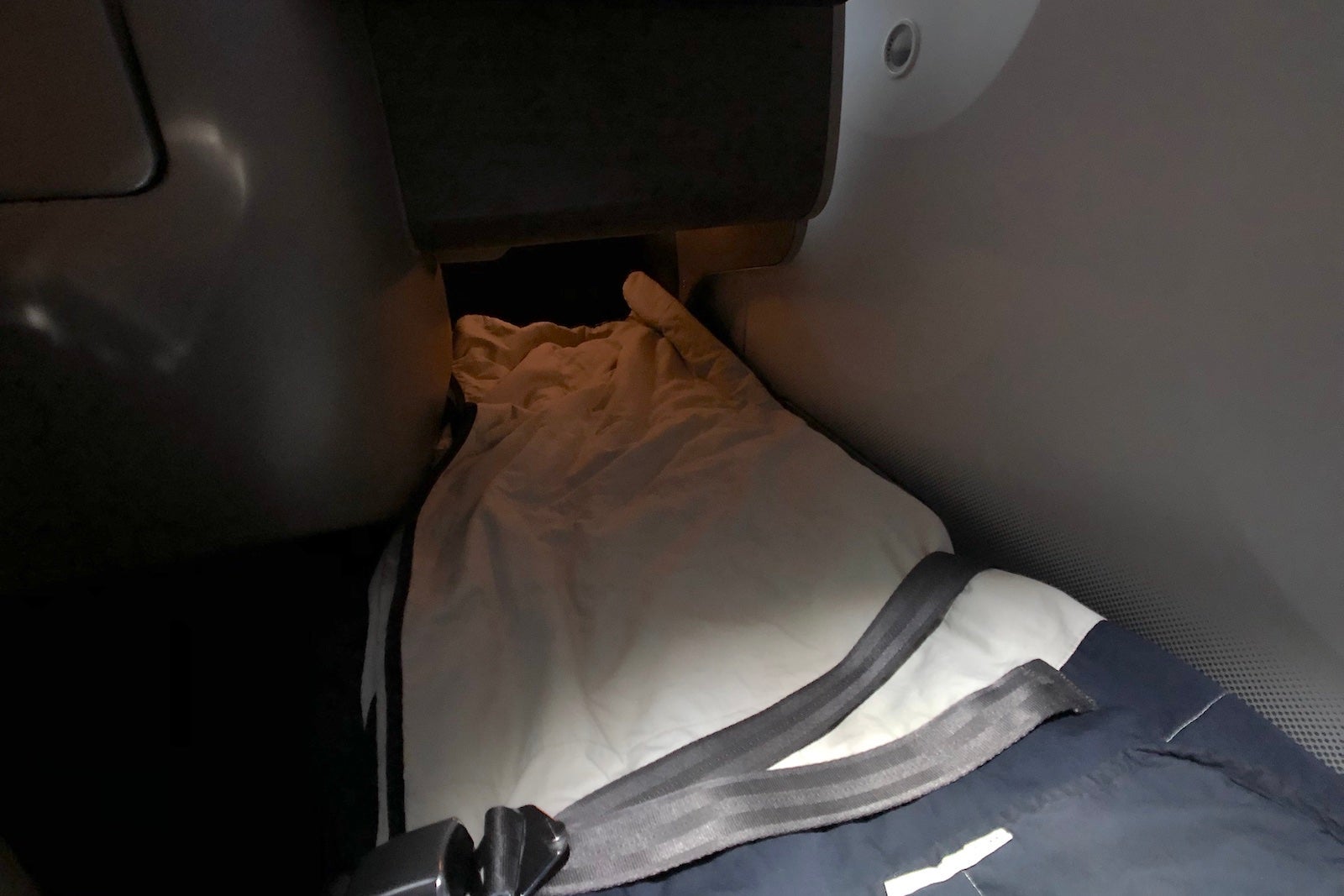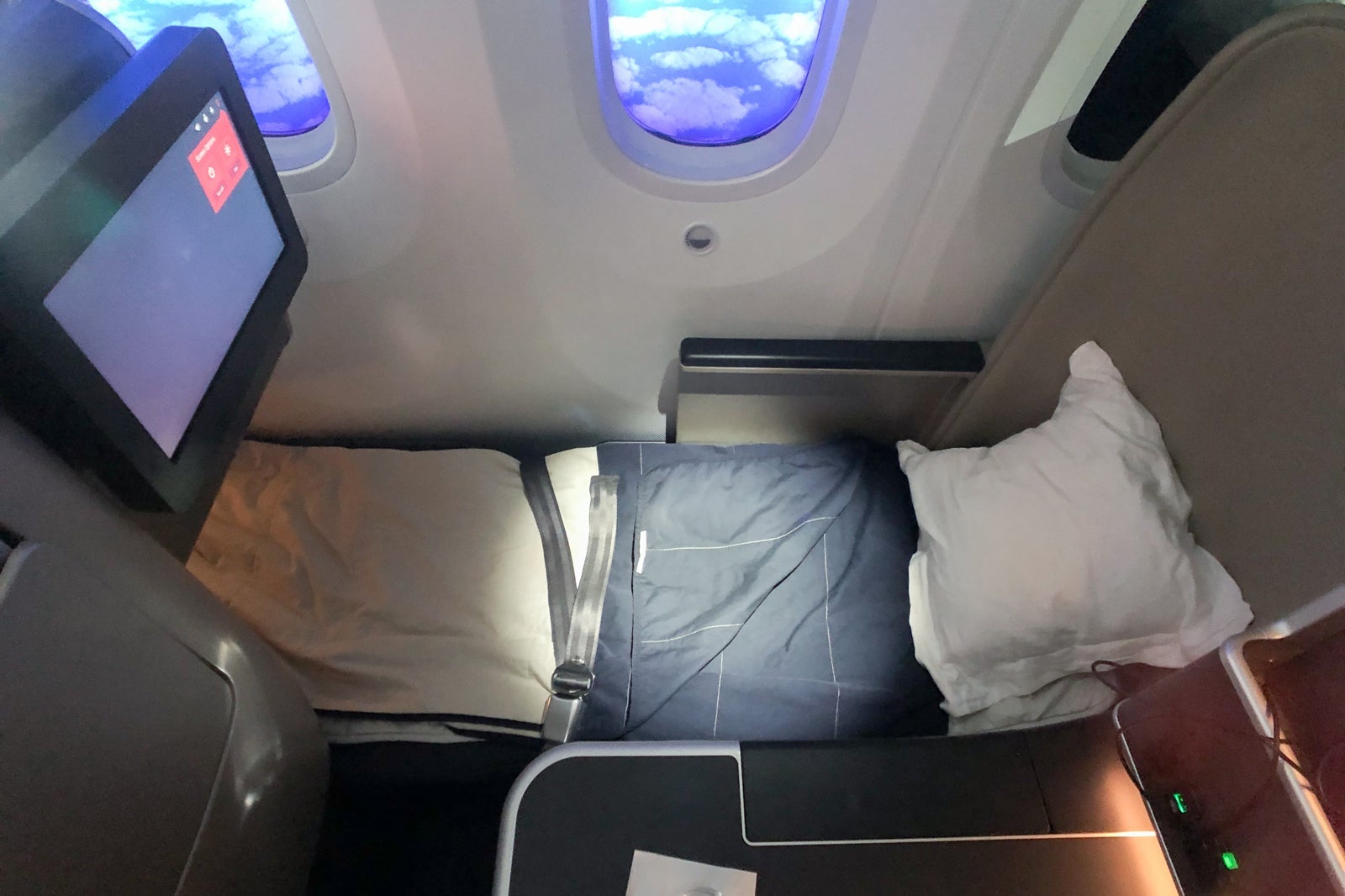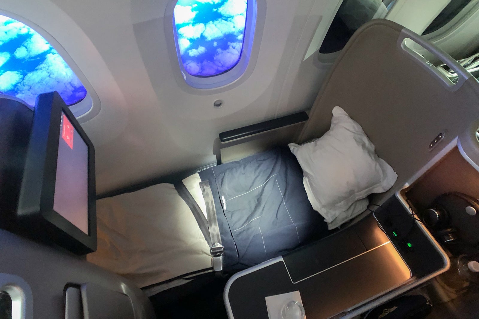 In lie-flat mode, the seat reclines to an 80-inch-long bed. When I boarded, there was a seat cover/mattress pad combo, a cotton duvet and a medium-size pillow waiting for me. Later in the flight, I slipped the cover over the back of my seat, pushed the lie-flat button on the control panel and waited for it to go flat before straightening out the rest of the cover to overlay the foot of the seat. I lay down, pulled the blanket over me, buckled my seatbelt and was off to dreamland.