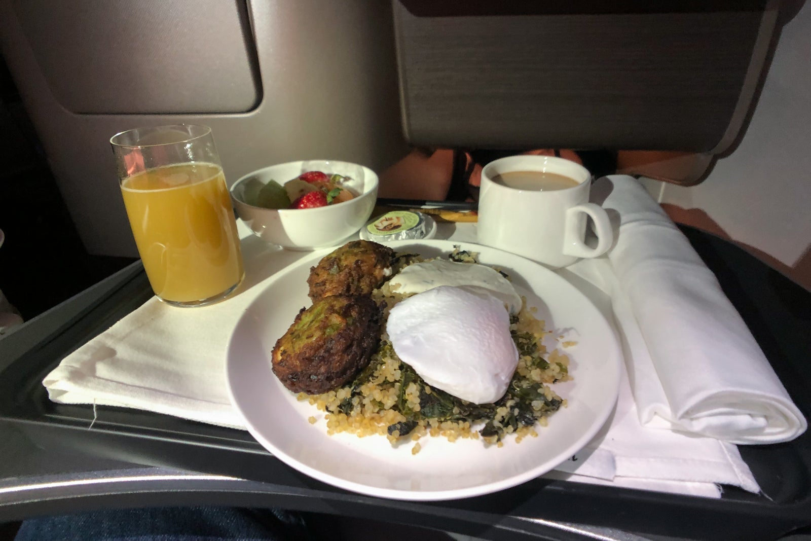 Before turning in, I had filled out a breakfast menu where I'd opted for an Urban Remedy cold-pressed juice with cucumber, apple, pineapple, pear, celery, kale and lemon. It proved to be tangy and fresh — perfect before my usual drink of choice, a coffee with milk and sugar (served in one of the airline's distinctive Noritake bone china mugs, of course).