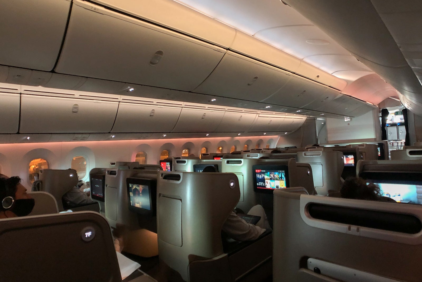 Two of the nice things about this particular Boeing 787-9 cabin are that there are overhead bins along the sides and the center so that every passenger had plenty of space for their personal belongings, and each seat has individual air nozzles to control the temperature.