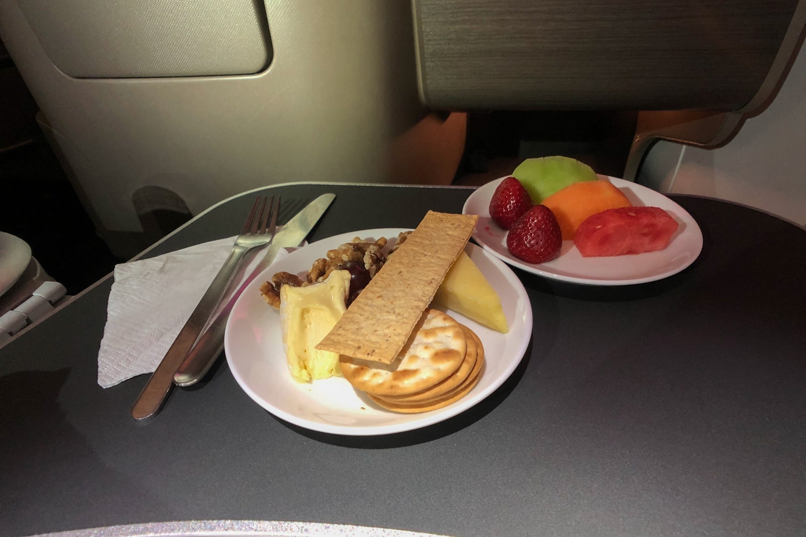 My meal ended with a selection of cheese and crackers and a bowl of fresh fruit. I watched the end of a movie then went to sleep for several hours, skipping the mid-flight anytime menu that had options like a croque monsieur, spinach-feta quiche with caramelized onion and crudites with dip.