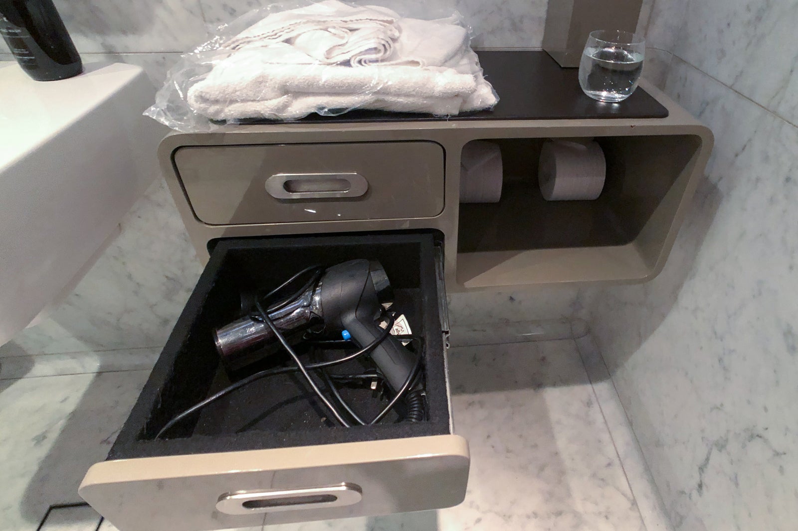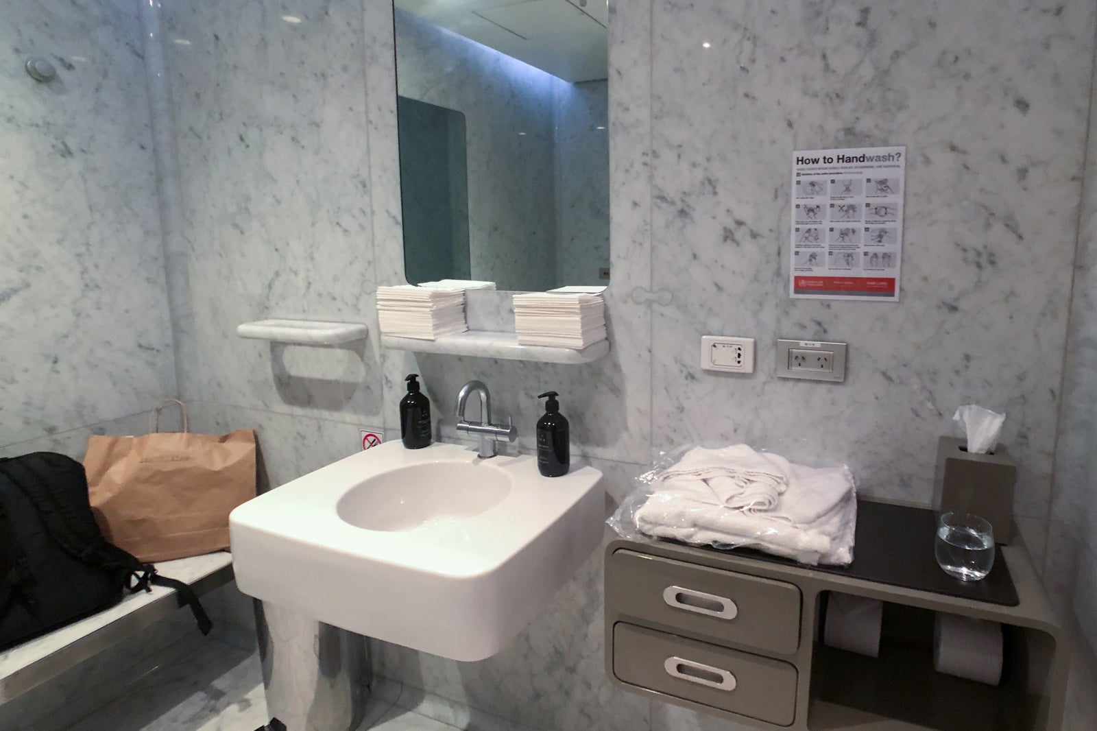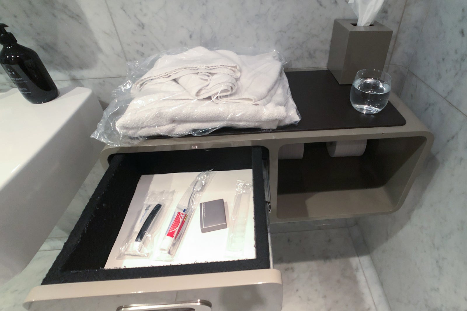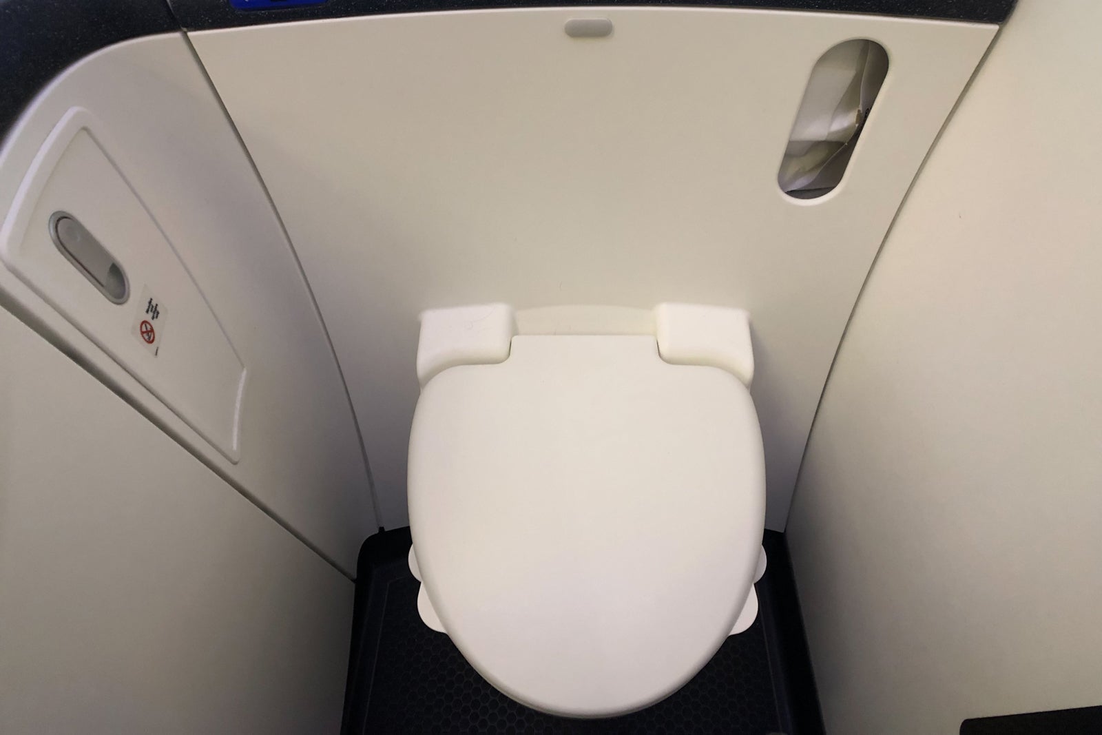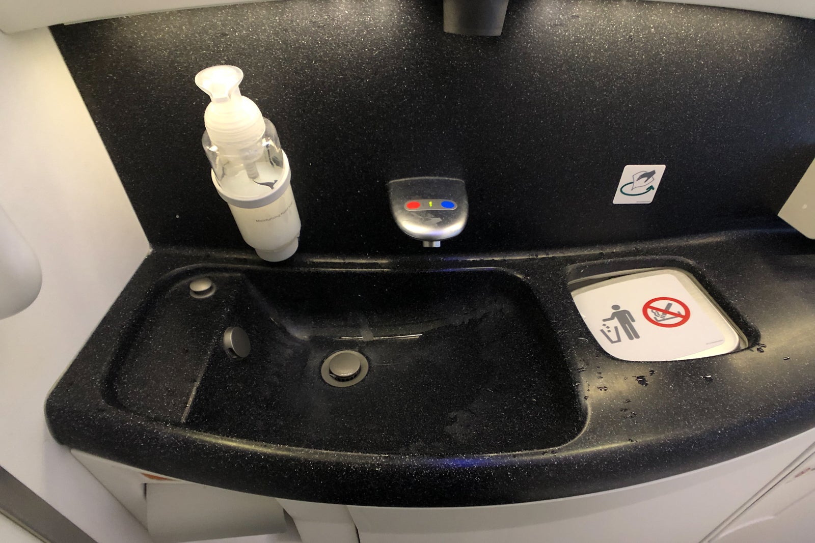 Business-class passengers have access to three dedicated lavatories, one at the front of the cabin near the cockpit door and two on either side of the galley between the two business-class cabins. I mostly used the latter since the front one always seemed occupied, but the back ones rarely were. Flight attendants came through periodically to wipe them down, and I appreciated the no-touch toilet and sink. There weren't any special amenities to mention, just a bottle of hand soap.