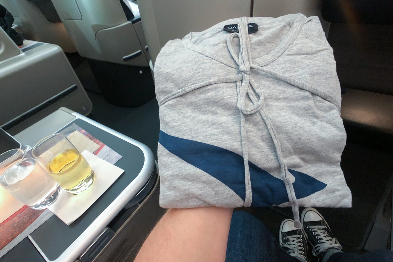 My hands-down favorite Qantas business-class amenity, however, has to be the pajamas they hand out, which include a set of pants and a long-sleeved, T-shirt-style top. Flight attendants offered each passenger a choice of small/medium or large/extra-large. Although the smaller ones fit me just fine, I always opt for larger pajamas that I find to be more breathable. Made of gray cotton and emblazoned with a kangaroo on the front and "QANTAS" on the back, these were as comfy as I remembered, and I wore them for most of the flight.