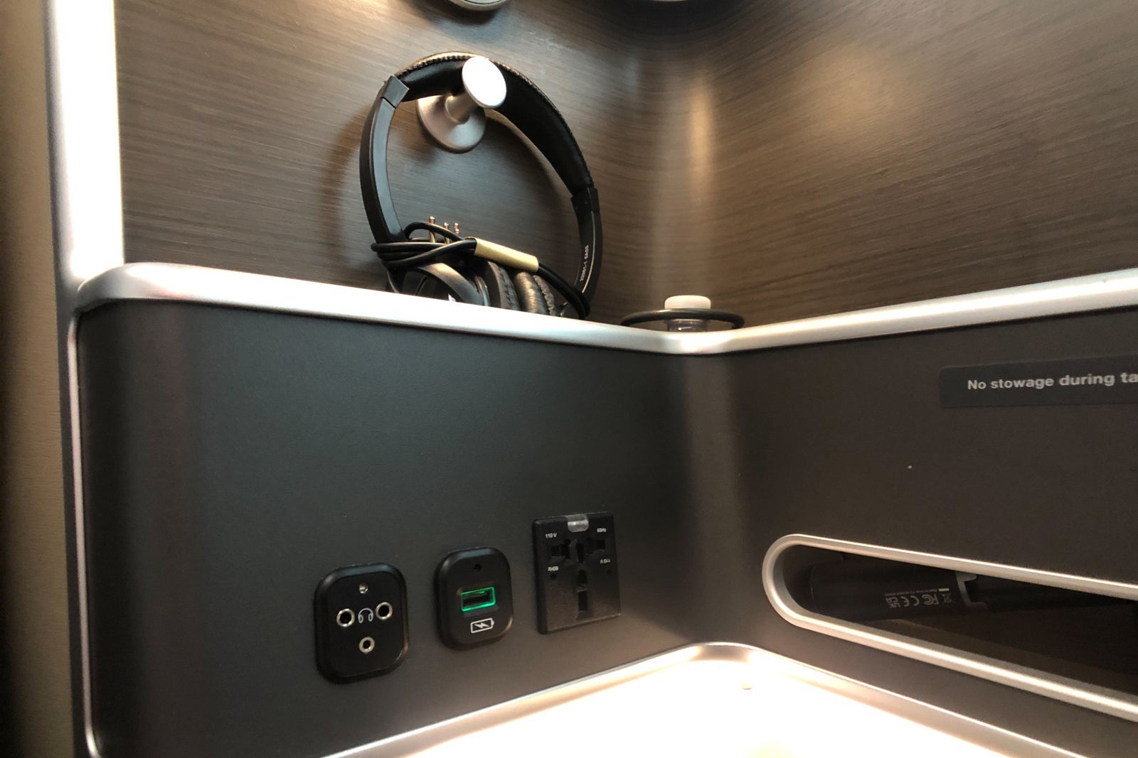 The wide armrest contains a small pop-up cabinet holding the remote for the entertainment system and a small mirror. Above that is a narrow shelf that you can use to stow small electronics, a holder for water bottles, and a peg to hang the provided headset. Along the seatback side are ports for USB charging, a universal power adapter and the headphone jack.