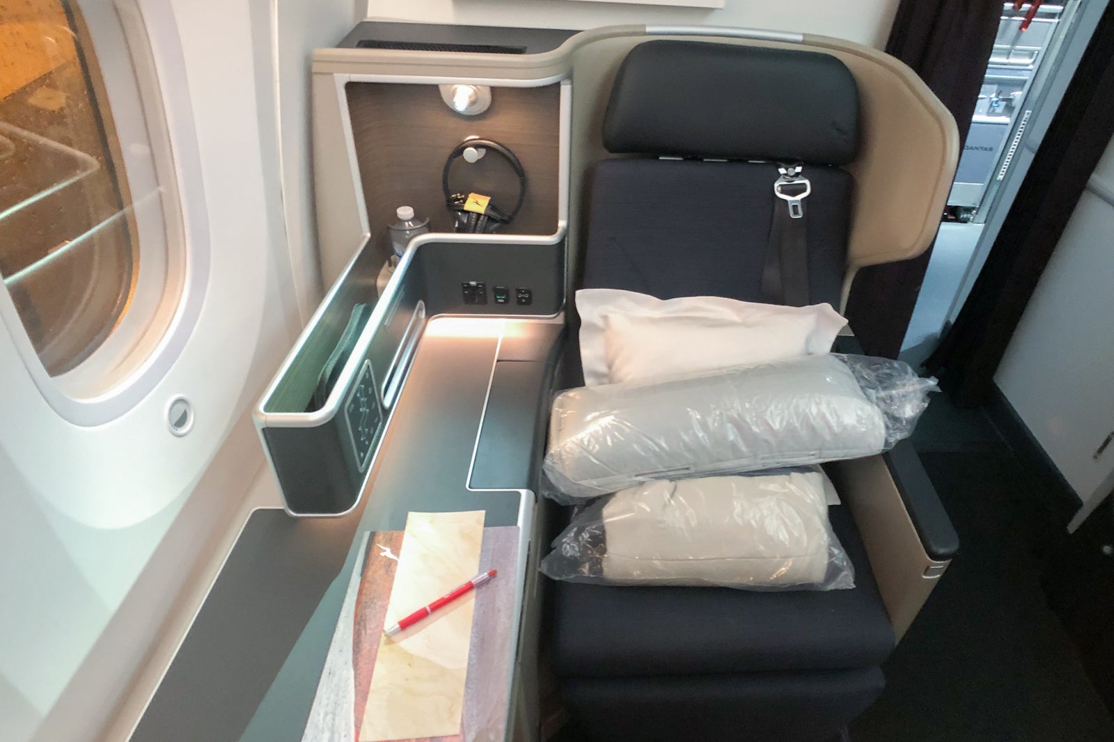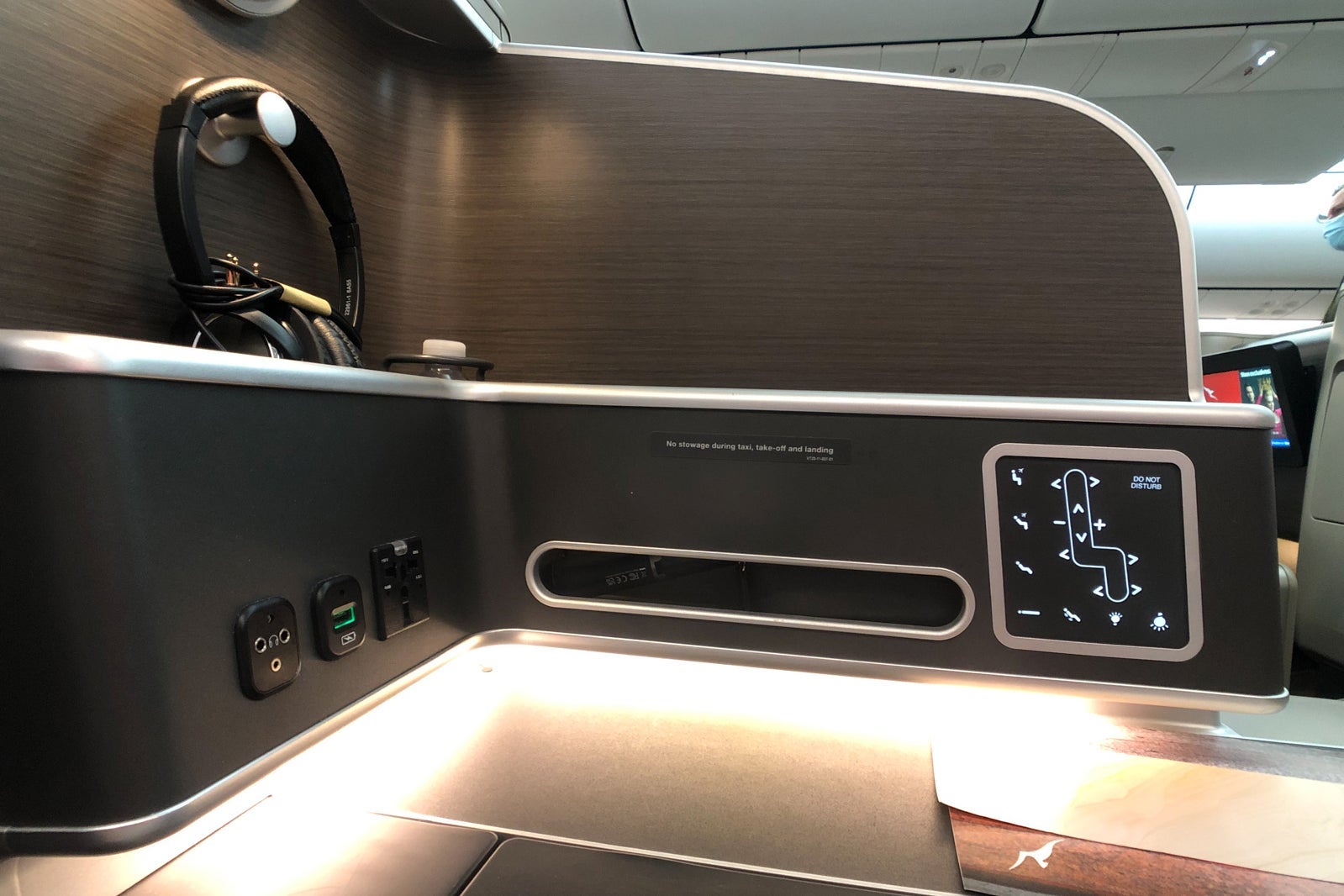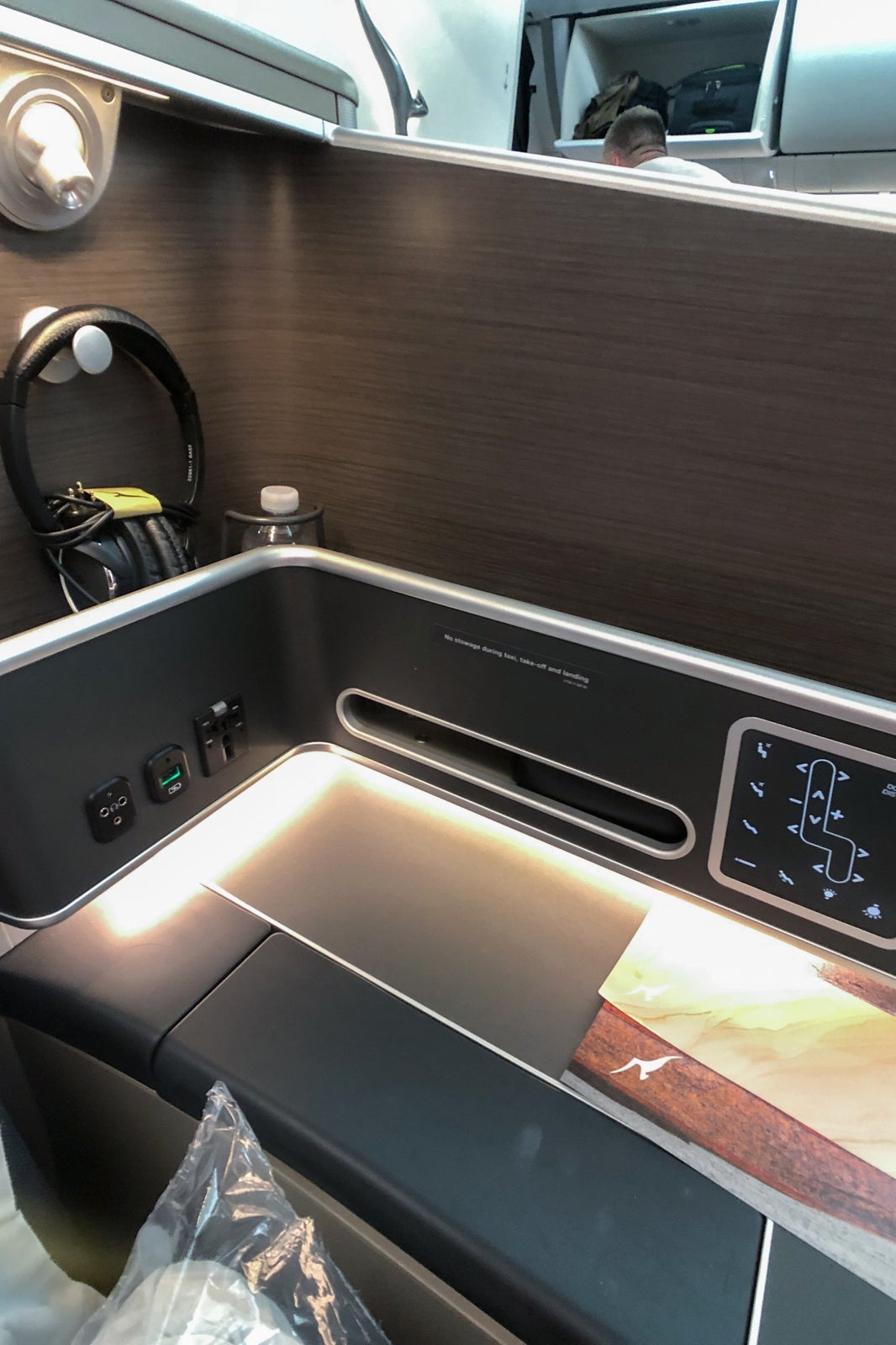 These are Vantage XL seats from Thompson Aero, much like you'll find on SAS and in Delta One (though the latter have been significantly modified to become suites with closing doors). The aesthetic Caon and Qantas went for was slightly austere — silvery seat shells, charcoal-gray seat upholstery, chocolate-brown faux wood paneling — but it feels sleek and sophisticated rather than stark.