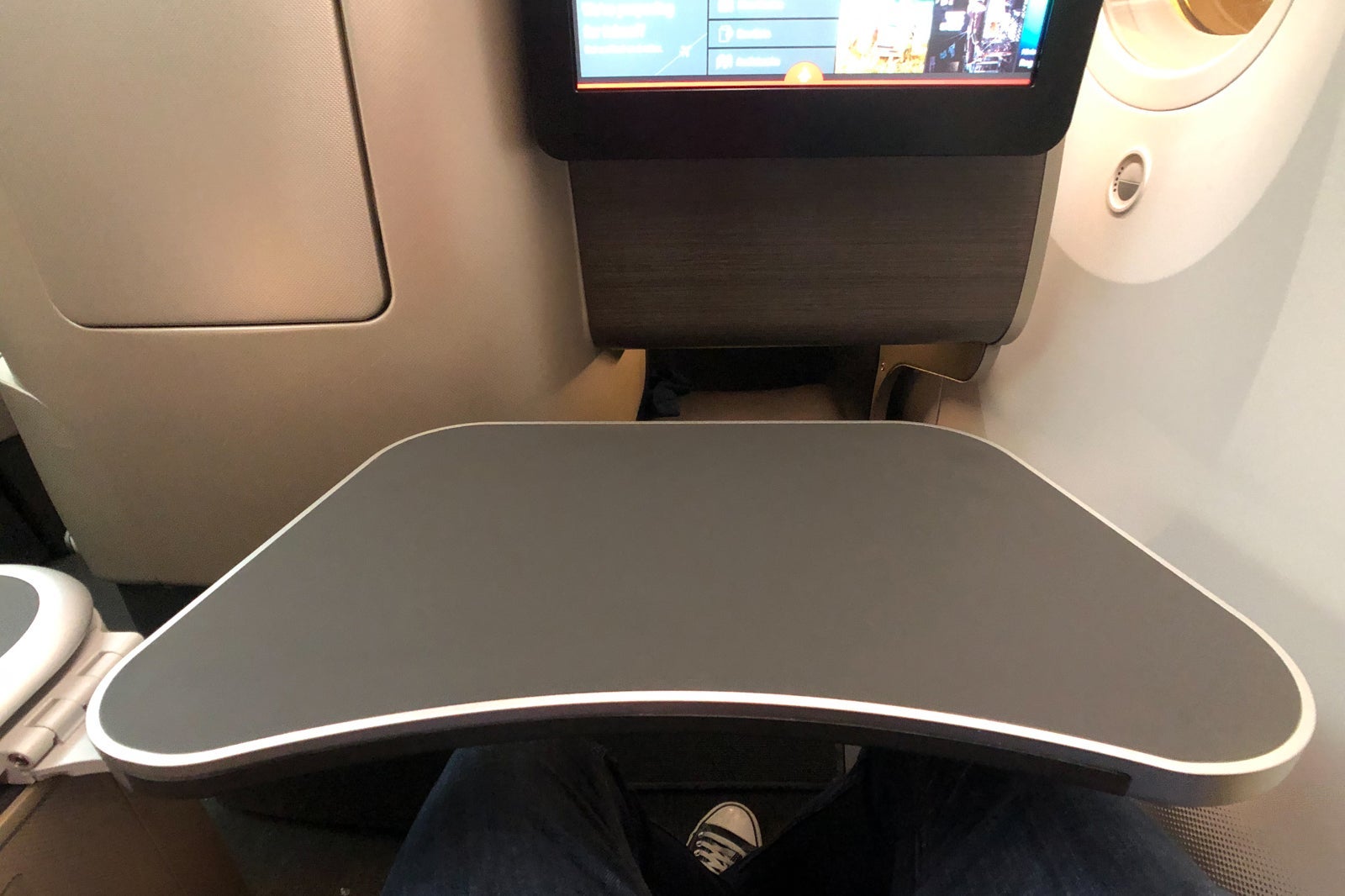 The tray table is released by a latch on the wide armrest and rotates out then slides forward and back for easy access if you need to leave your seat. It measures 19 inches across and 10 inches wide, so it is not huge, but it was big enough to fit my Macbook Pro easily.