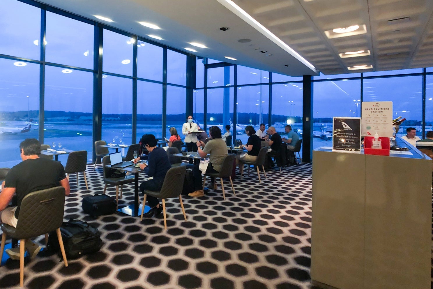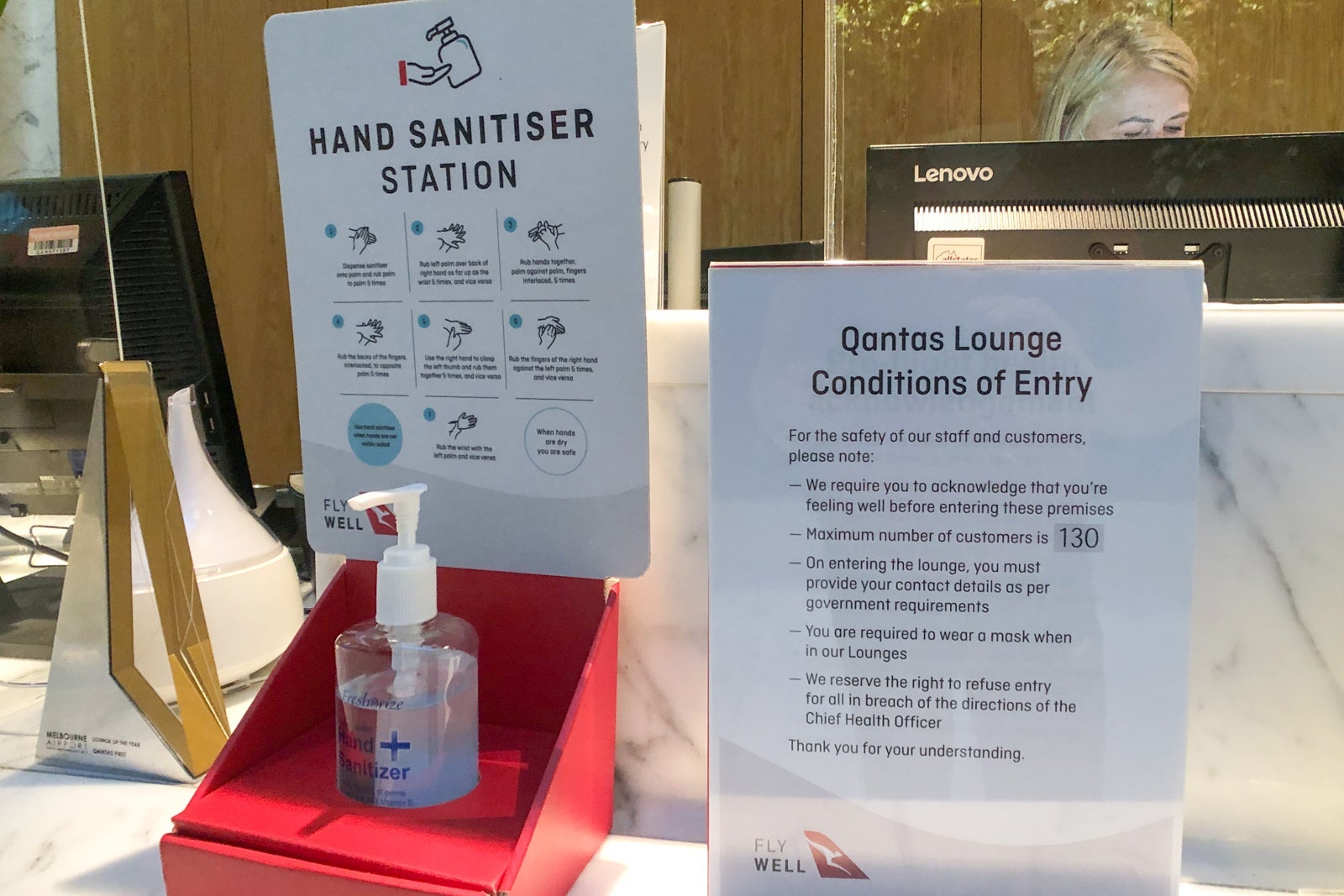The lounge's capacity was capped at 130 customers, though there was nowhere near that number when I arrived. I noted the hand sanitizer display and a sign indicating that I was required to wear a mask and to acknowledge to staff that I was feeling well. I showed my boarding pass to the reception agents and admired the small living wall of plants opposite.
