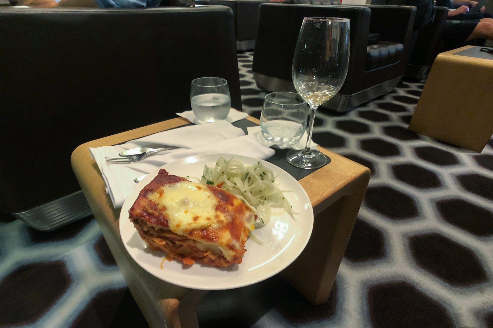 Each Qantas First Lounge serves a specific seasonal menu, though you can always find staples like Perry's salt-and-pepper squid with green chili dipping sauce. Given how busy the restaurant was becoming, I chose to sample the food at a seat at the other side of the lounge and was encouraged to try the lasagna with shaved fennel, lemon and parsley salad. It was hearty but delicious; I didn't want to fill up before my flight, so I only had a few bites.