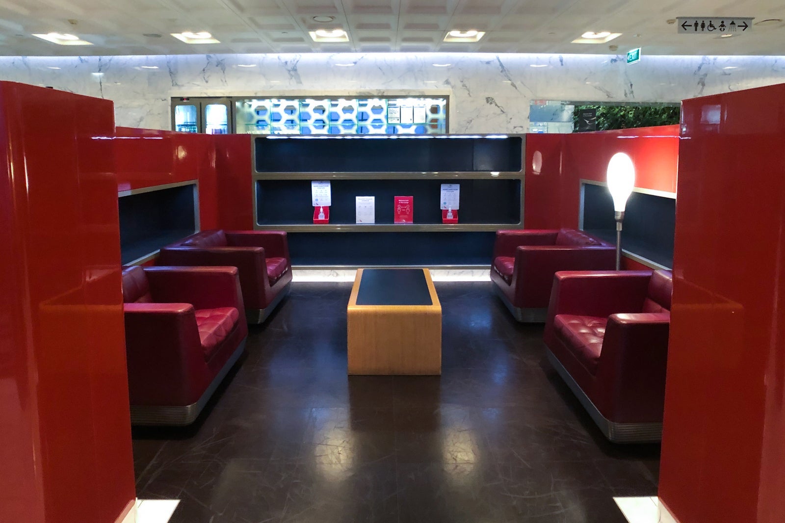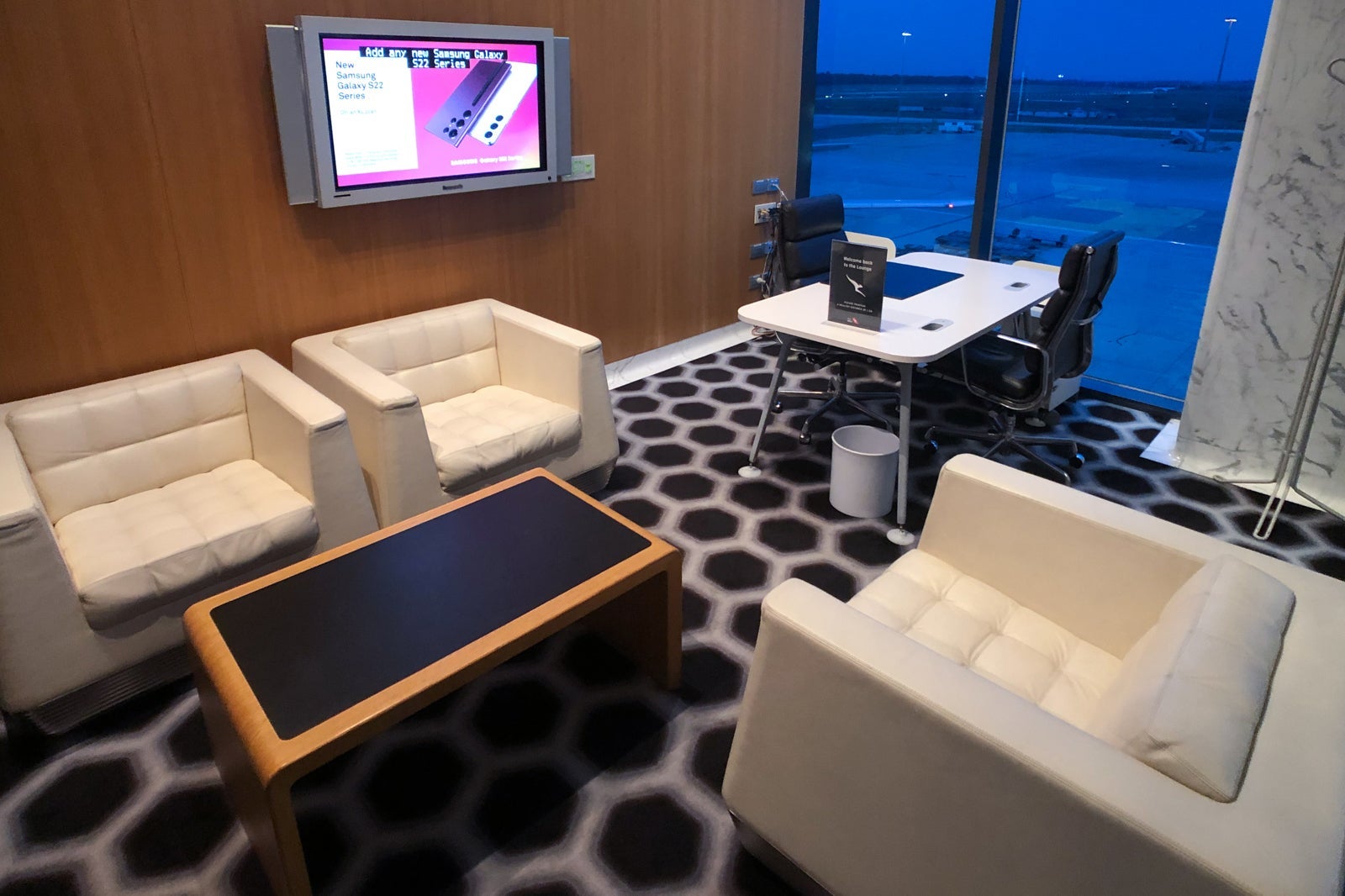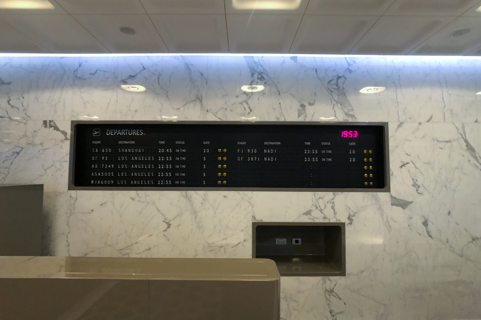 This lounge looked like Qantas' flagship First Lounge in Sydney, only it was much smaller. Like the Sydney outpost, this lounge was designed by Marc Newson, who also took charge of designing the airline's original A380 interiors over a decade ago. The ambiance was meant to evoke the golden age of travel — hence the retro Solari departure display board and other classic elements like gray-veined white marble floors and wall tiling, European oak partitions to section off intimate seating areas and squared-off, low-profile armchairs and sofas that wouldn't have looked out of place in Don Draper's office.