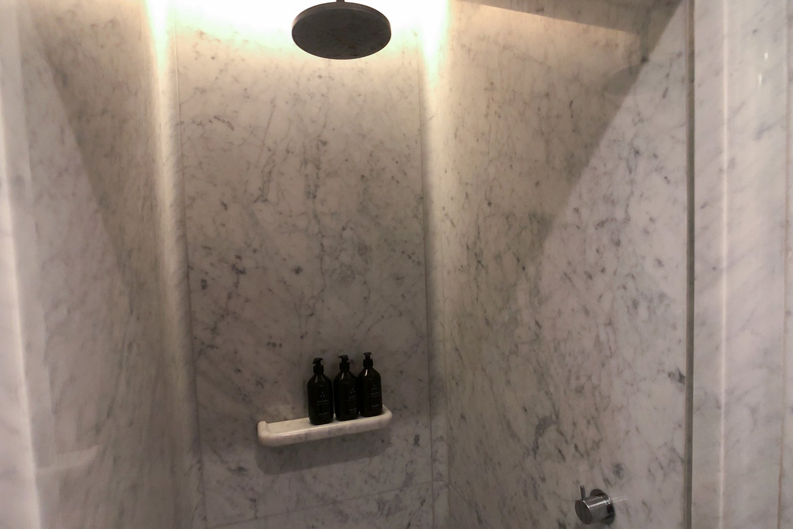 I wish my bathroom at home looked like this, what with all the gleaming marble, a walk-in shower cabine and a separate cubby for the toilet.