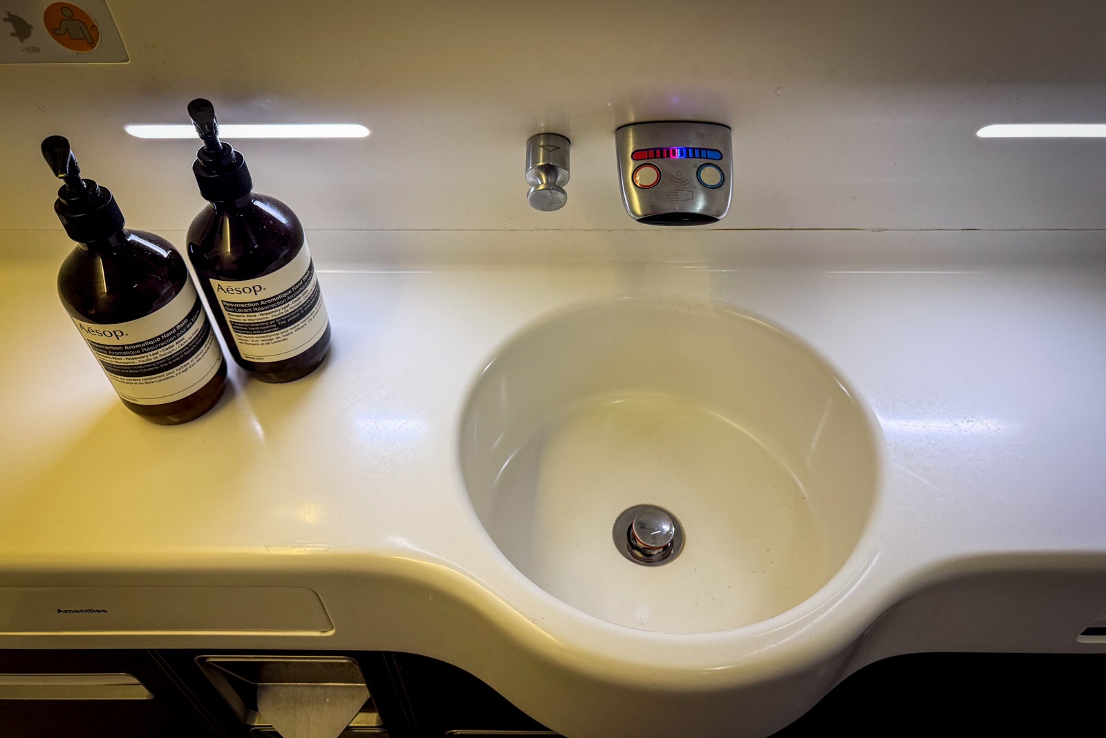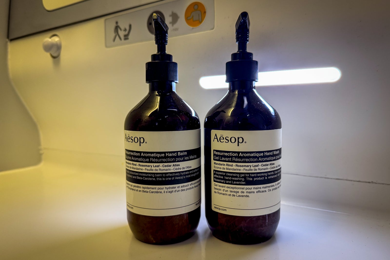 There are two dedicated first-class lavatories at the front of the cabin on either side of the plane's staircase. The crew kept them spotless throughout the flight, and they were stocked with rosemary- and cedar-scented Aesop Resurrection Aromatique hand wash and hand balm.