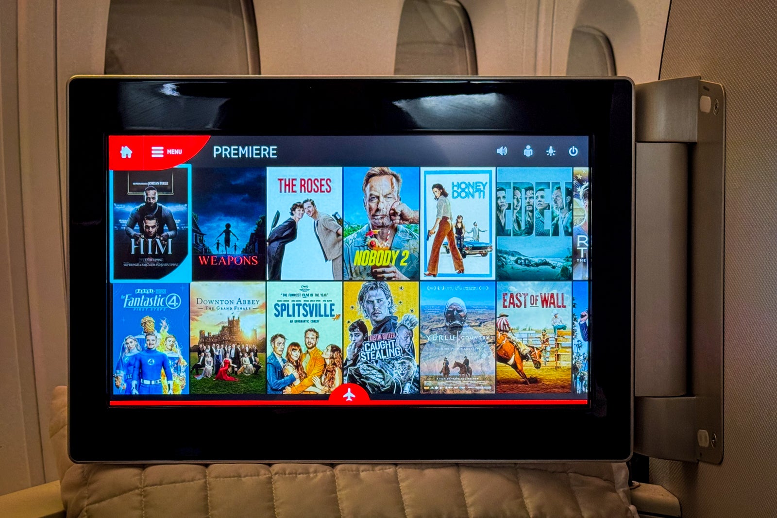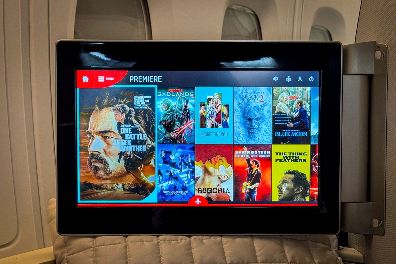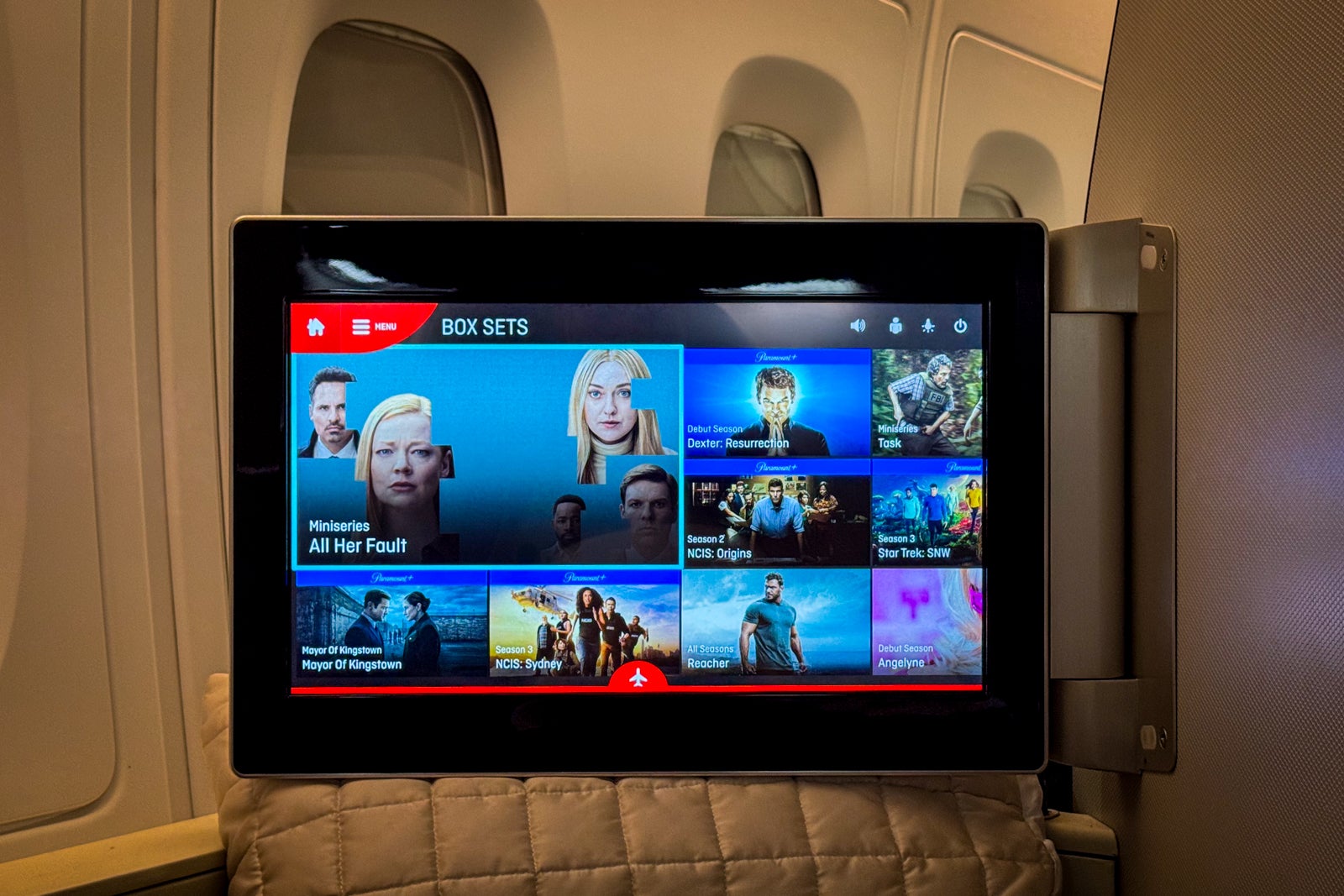 Qantas first-class seats have 18-inch entertainment monitors that swing out from the preceding seatback. They have an extensive library of content loaded into them. I found new-release movies like "One Battle After Another" and "Tron: Ares," plus TV shows like the Australian version of "Ghosts," "Reacher" and "All Her Fault" on hand.
