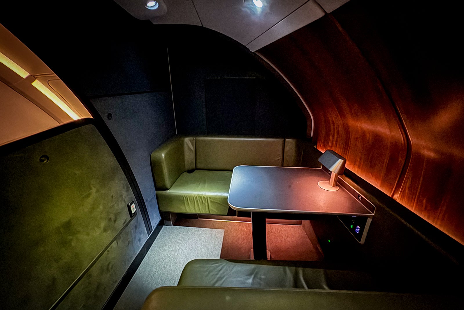Across from the seat, an ottoman doubles as a second seat if you want to invite a travel companion over for a chat or to share a meal on the enormous double-folding tray table (it measures 36 inches diagonally) that pulls up and out of the windowside seat console.