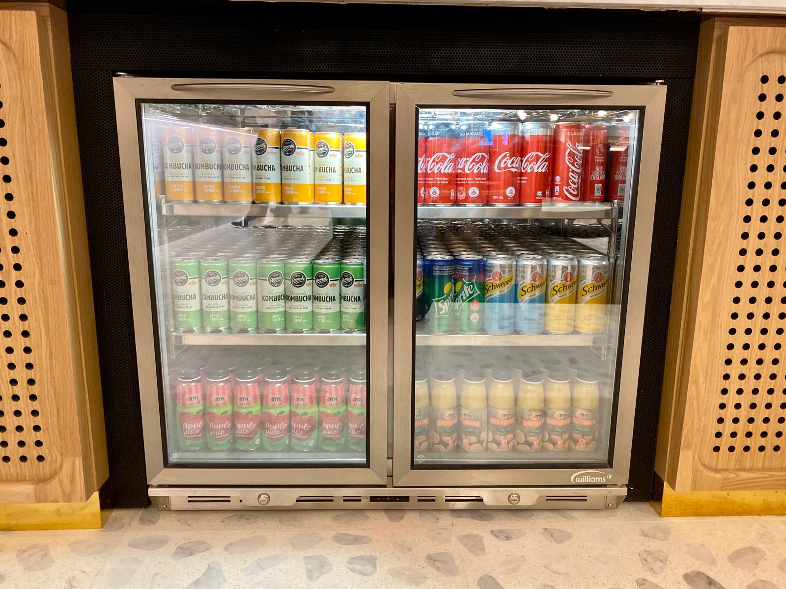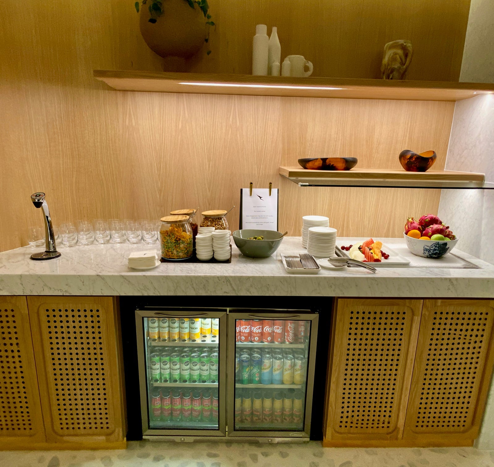 A drink fridge sat below the small buffet. In addition to the usual Coca Cola-branded soft drinks, Qantas stocks two flavors of kombucha (apple and ginger), a nice touch for health-conscious travelers.
