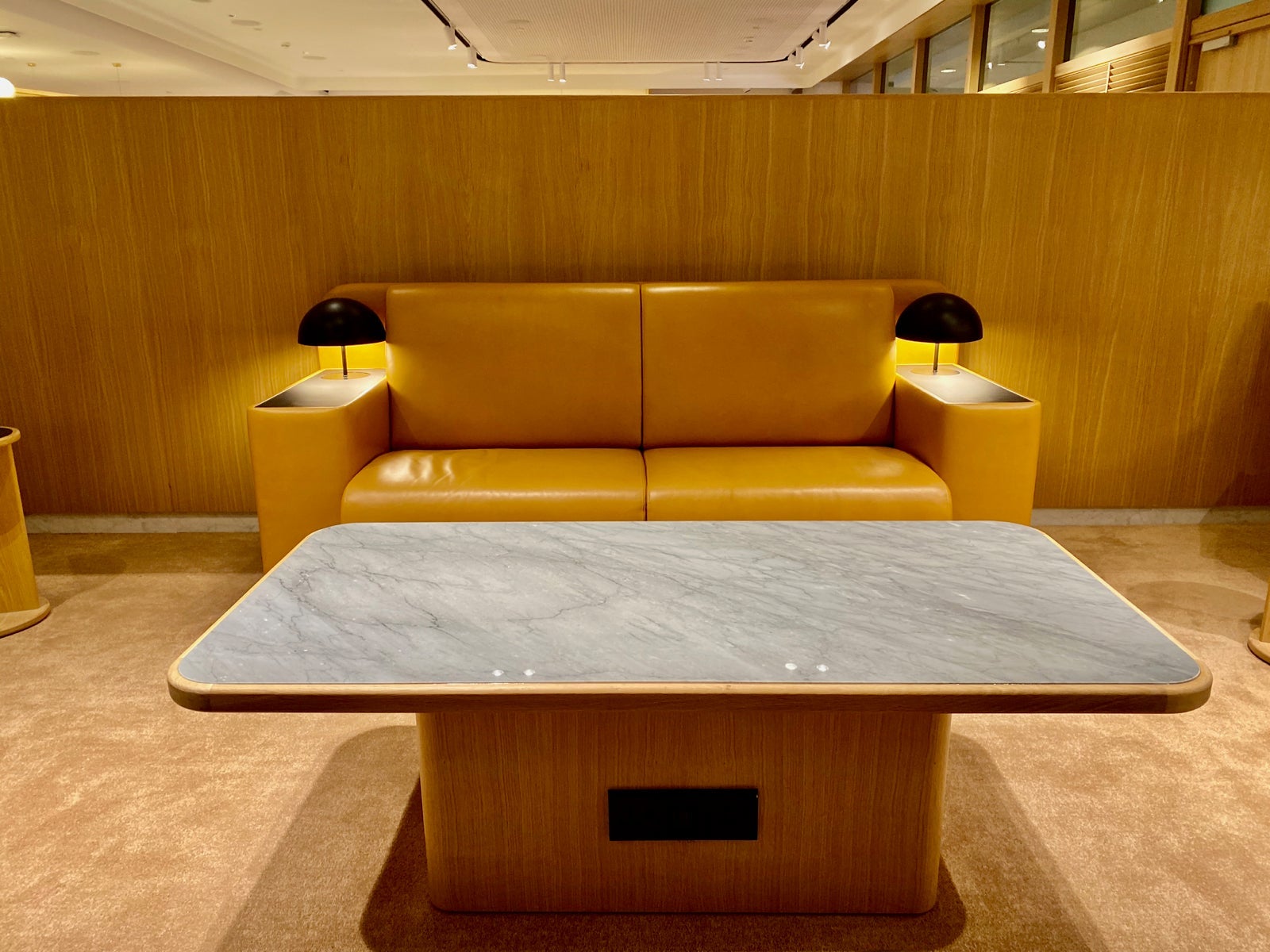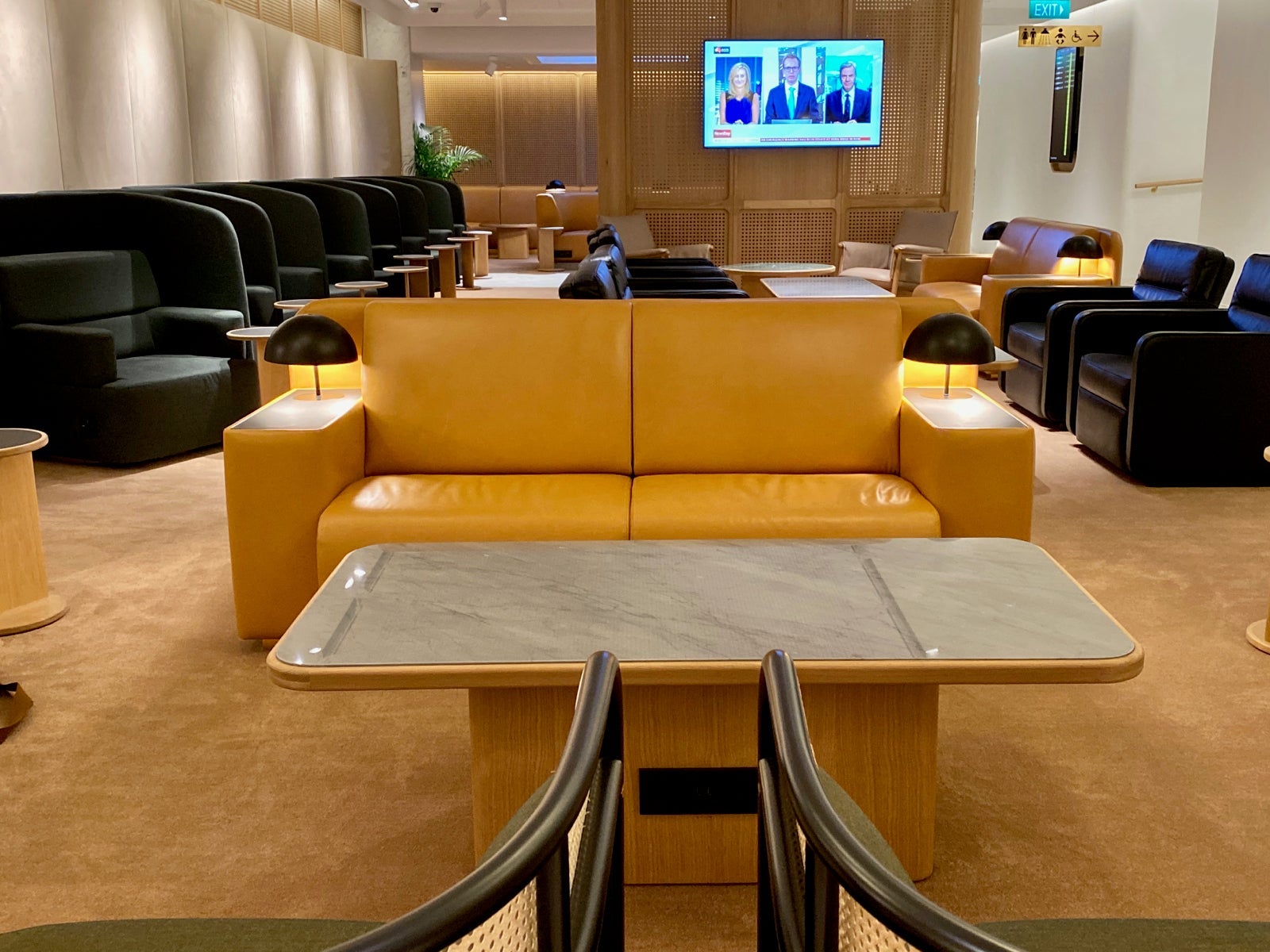 The highlight for me was the mustard-colored twin couches by Australian designer David Caon. In general, the lounge's design was stunning, but I really liked those couches.