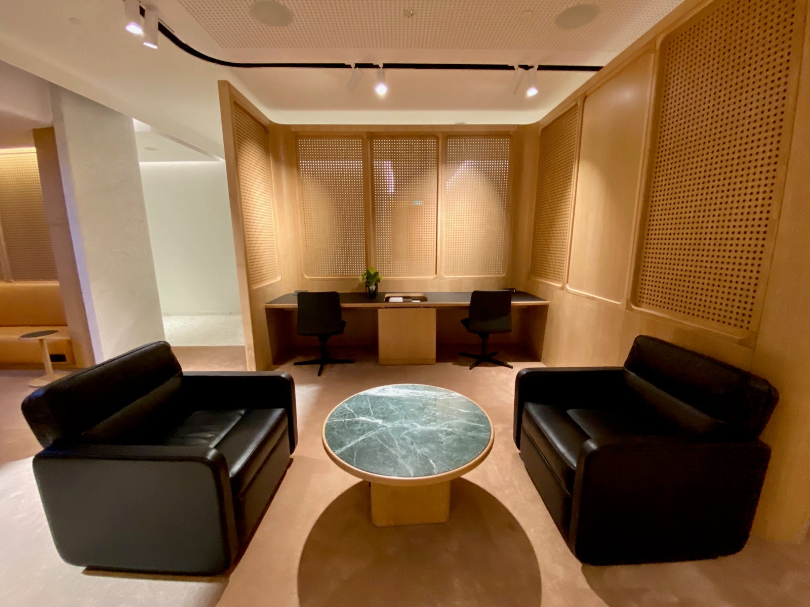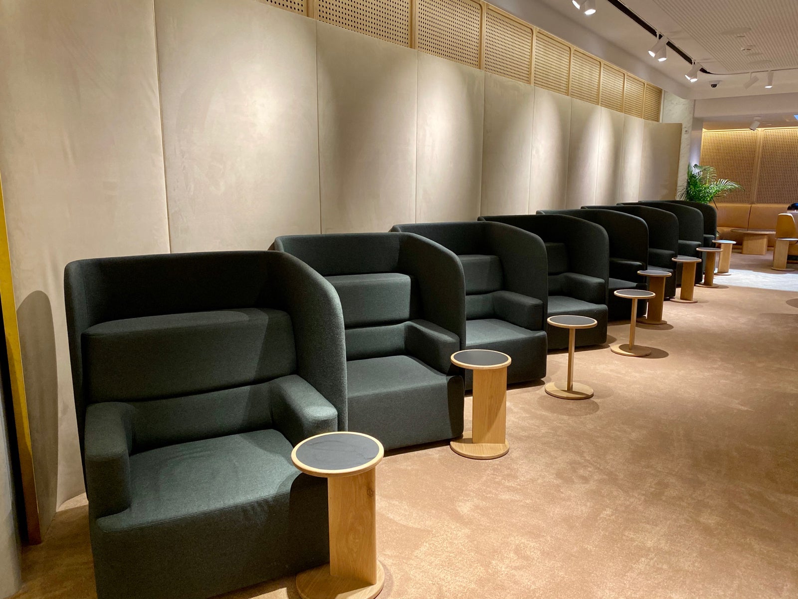 The relaxation and work spaces are right inside the entrance. There are a bunch of dark green relaxing chairs reminiscent of the carrier's newest business-class seat. They reminded me of the new iPhone 11 Pro.
