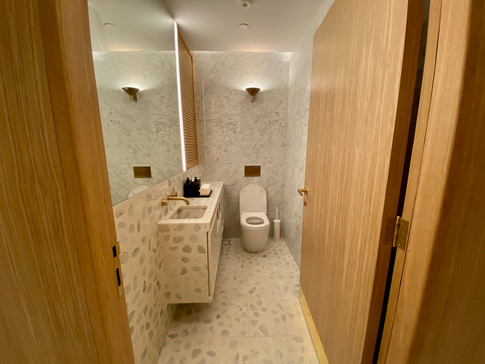 The lounge's restrooms are in a corridor near the entrance to the lounge. The restrooms are one-person lavatories separated by gender.