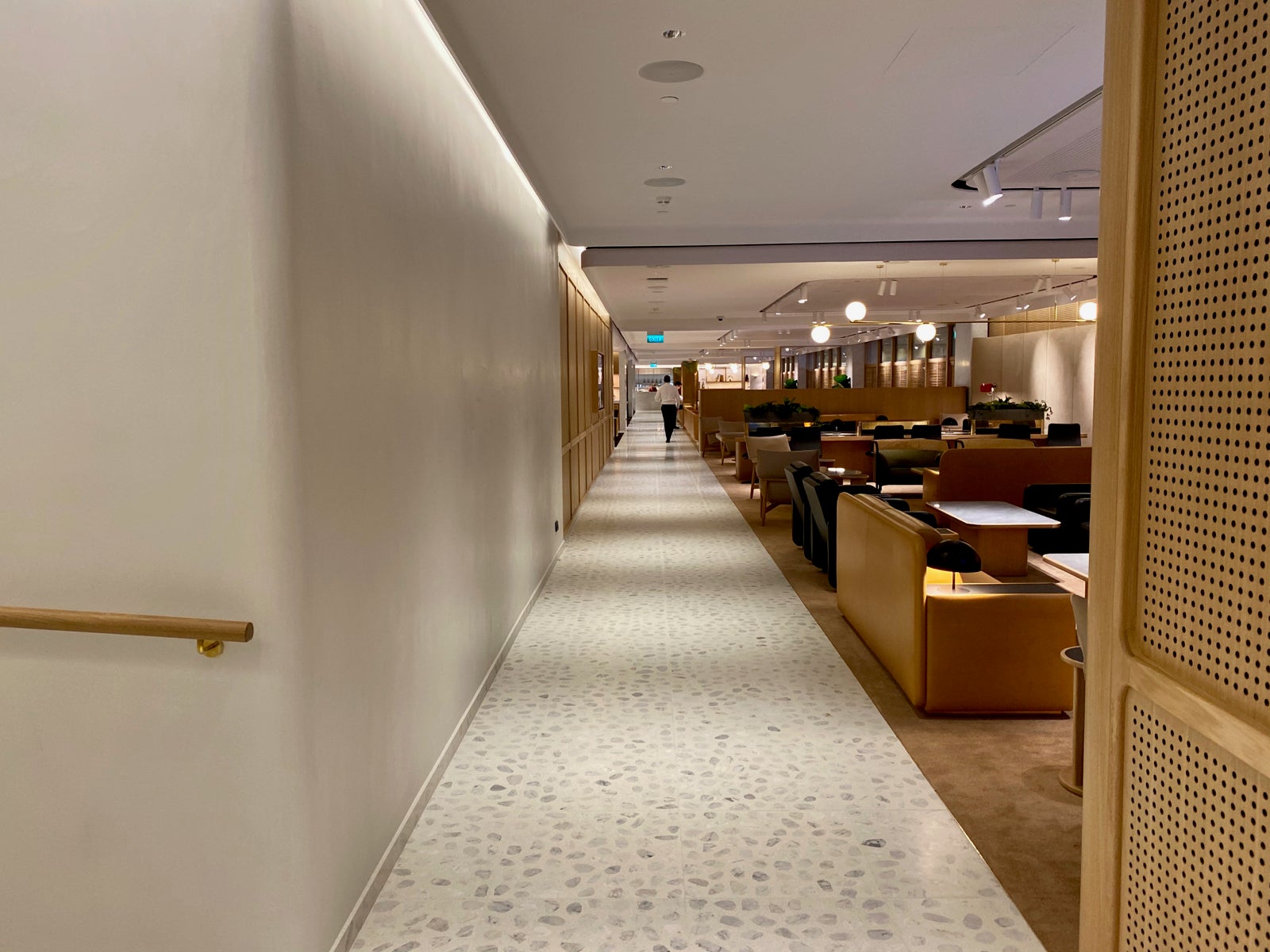 The lounge is basically one long rectangular corridor with various partitioned seating areas.